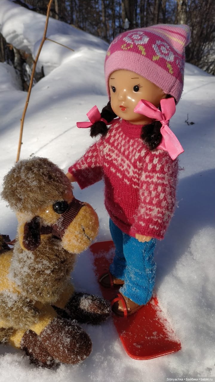 Юляшка верхом на Томе покоряет горку на сноуборде.
