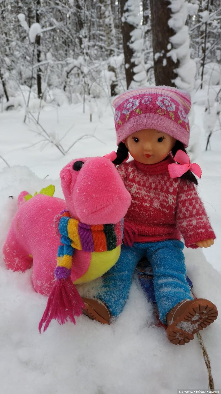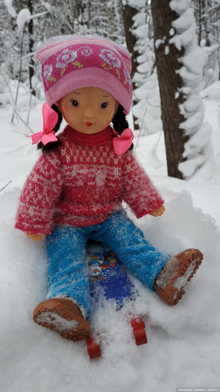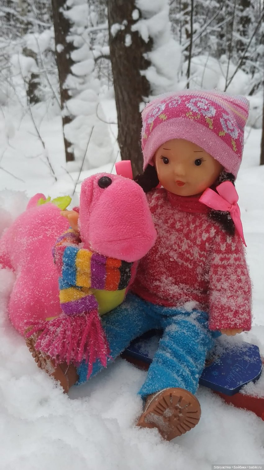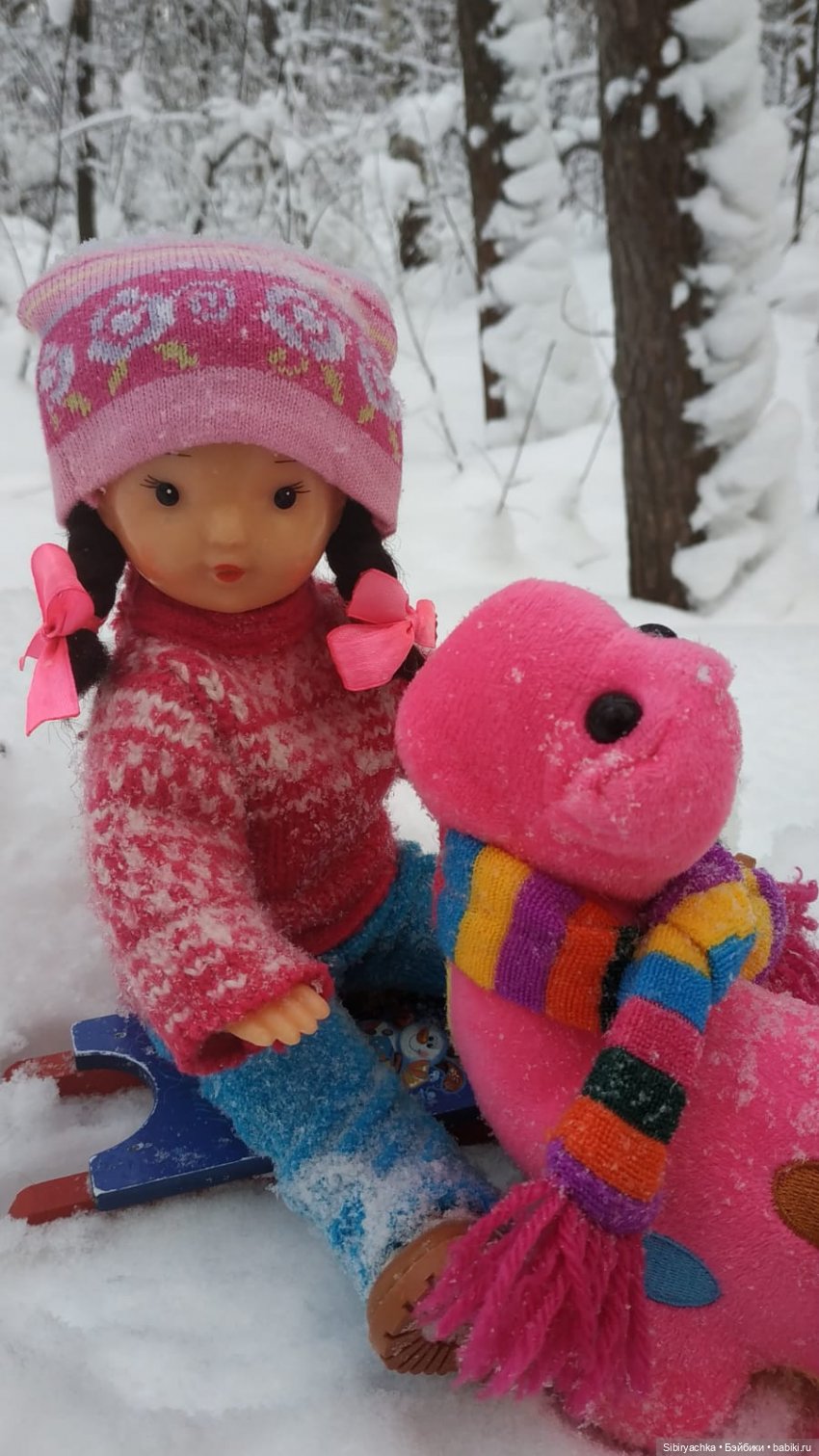 Нелегко забираться на высокую гору, но находчивая Юляшка и здесь нашла выход! Она использовала санки вместо лестницы и ловко карабкалась наверх!
