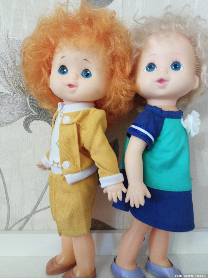 Ну вот стала вязать, а мне мои любимчики и говорят — мы будем твоими Домовятами! И я подумала, а почему бы и нет? Они веселые такие, удивительные, характерные, одна из моих любимых серий игрушек позднего Кругозора. Тасенька — заводила у них в команде. А Митюнечка — влюбленный в нее и такой чудесный ребенок. Оба очень открытые, простодушные и доброты невероятной. Тасюня деловая колбаса, а Митя… смешно, я когда вязала на них, представляла наши разговоры, разговаривала за них… все-таки каждая кукла это какая-то новая грань нашей внутренней жизни, главное дать ей проявить себя… Ну и Митенька говорит: Мама, знаешь, у нас Тася главная, я у нее подкаблучник! Я сама то это сказала и как засмеюсь… :)) И Таська со мной. Митюня, а что значит подкаблучник то? — Ну я просто очень в Тасеньку влюблен! :)) Вобщем общение с моими Домовятами это огромная радость. И знаете, как связала на них обновки, дело пошло! Смогла найти время заняться штукатуркой. А они мне помогали. Так что самые что ни на есть они мои Домовята, да еще и влюбленные! Думаю с ними мой дом станет лучше. И немного фото. Костюмчики связаны на спицах. С огромным удовольствием моим связаны, очень благодарные модели эти кукляхи.