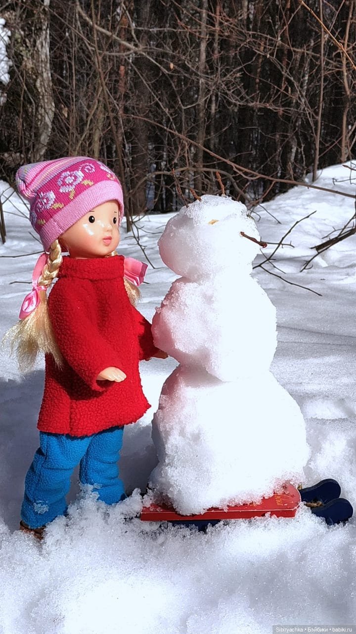 Снеговик получился достаточно тяжёлый. Юляшка попробовала толкать санки, но ничего у неё не получилось.