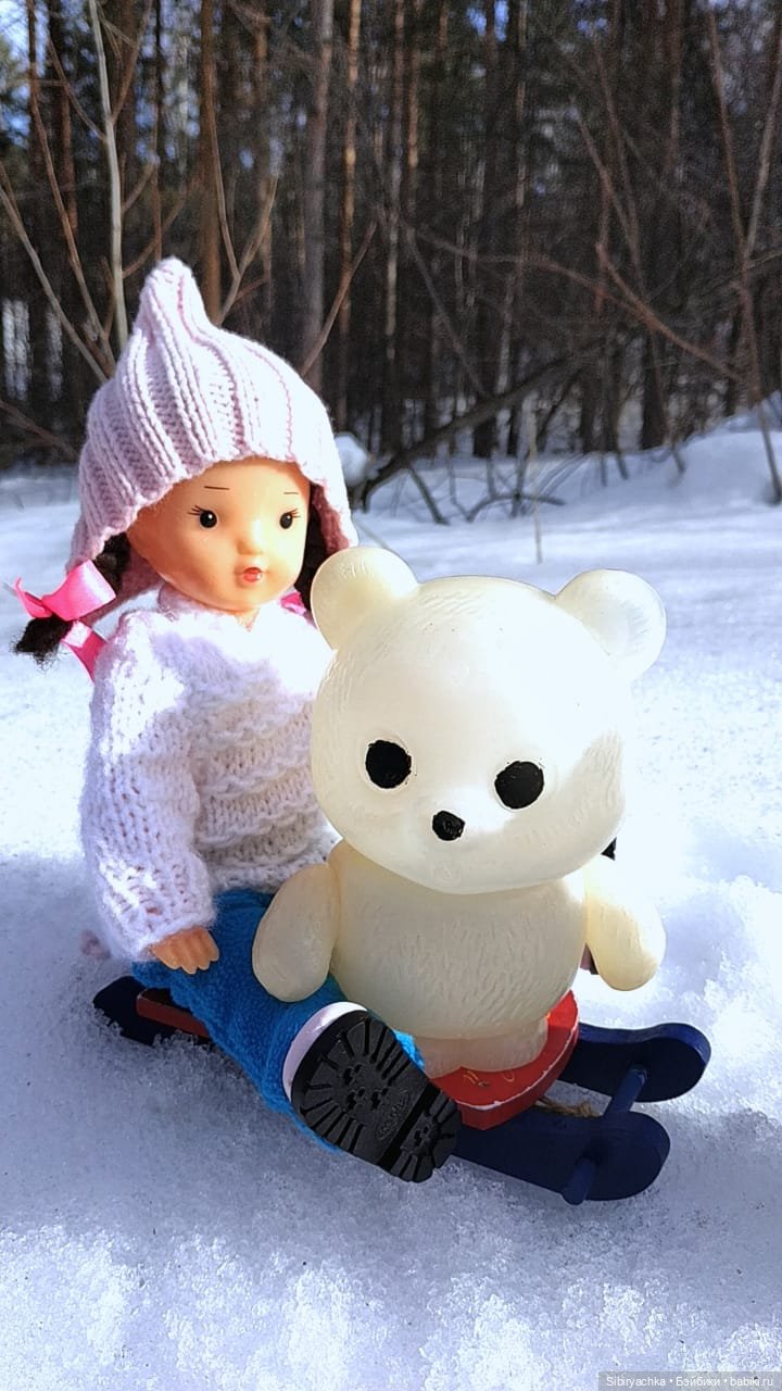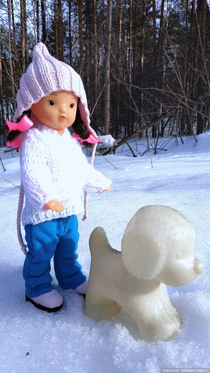 Юляшка каталась с горки, а снежная собака встречала её внизу.