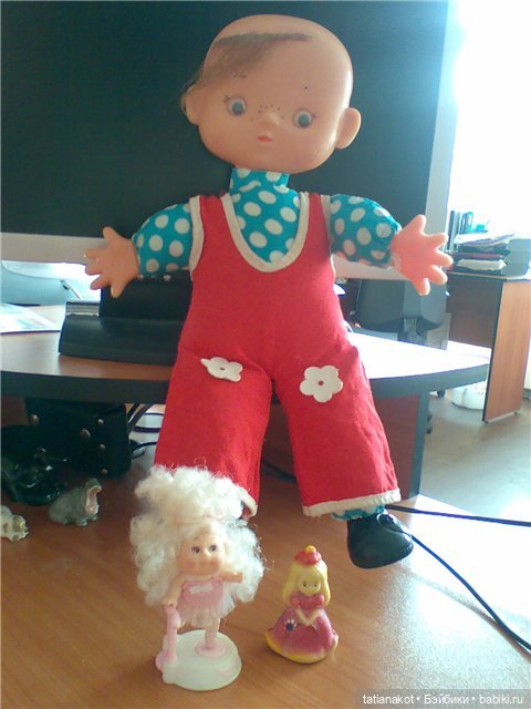 Второй — Антошка, он был в розовом вельветовом комбезе и кепке с волосами. Комбез не сохранился, а вот кепка есть. Комбез я восстановлю, а пока он у меня в фольклорном виде ждет обновления и паричка.