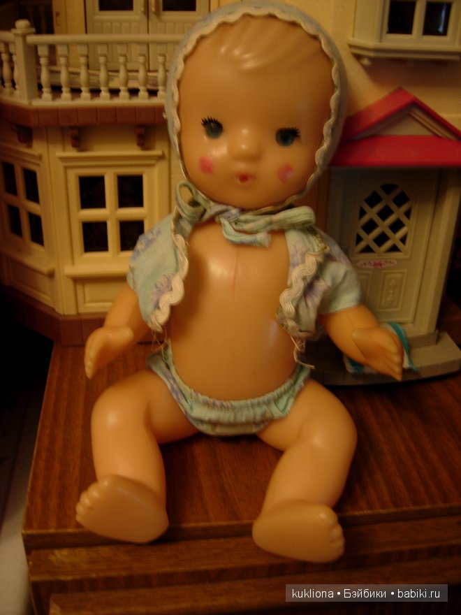 На счет дырочки не помню, надо у мамы спросить, а то может соска у нее была, ведь кукла живет у меня с тех пор, как я была совсем кроха. Я расскажу тебе больше, с моими старыми куклами до сих пор играют дети! С Анечкой в том числе, это в наше то время интерактивных кукол и компьютеров. У нее еще есть комбинезон, который я ей в детстве шила и кроватка.