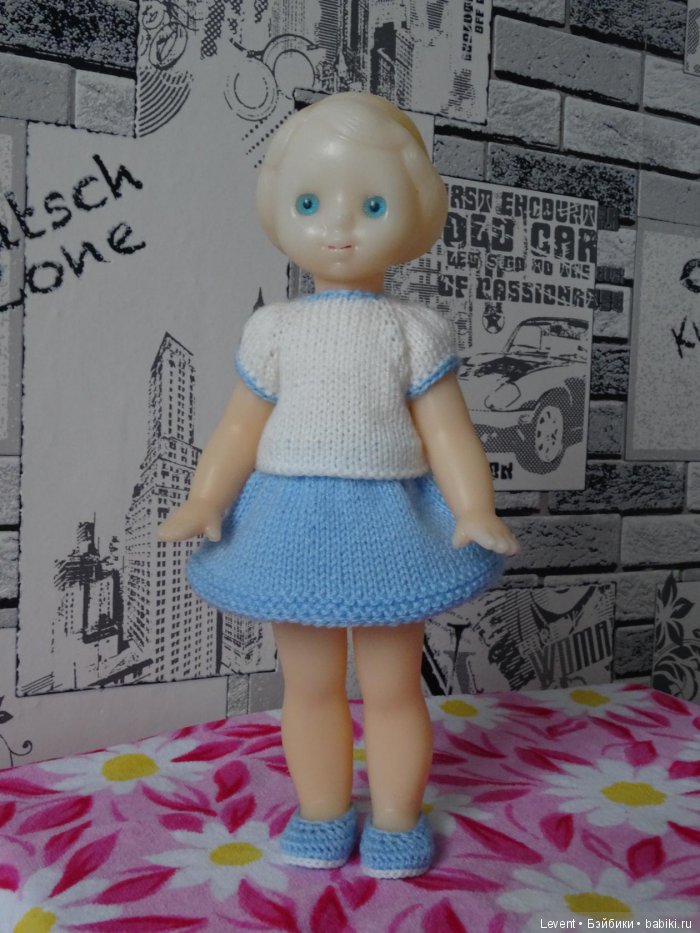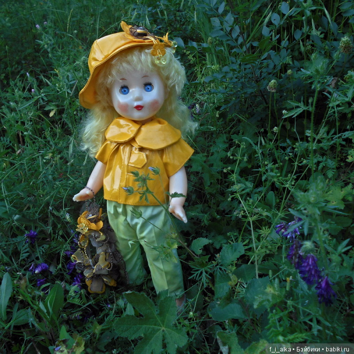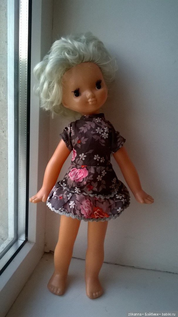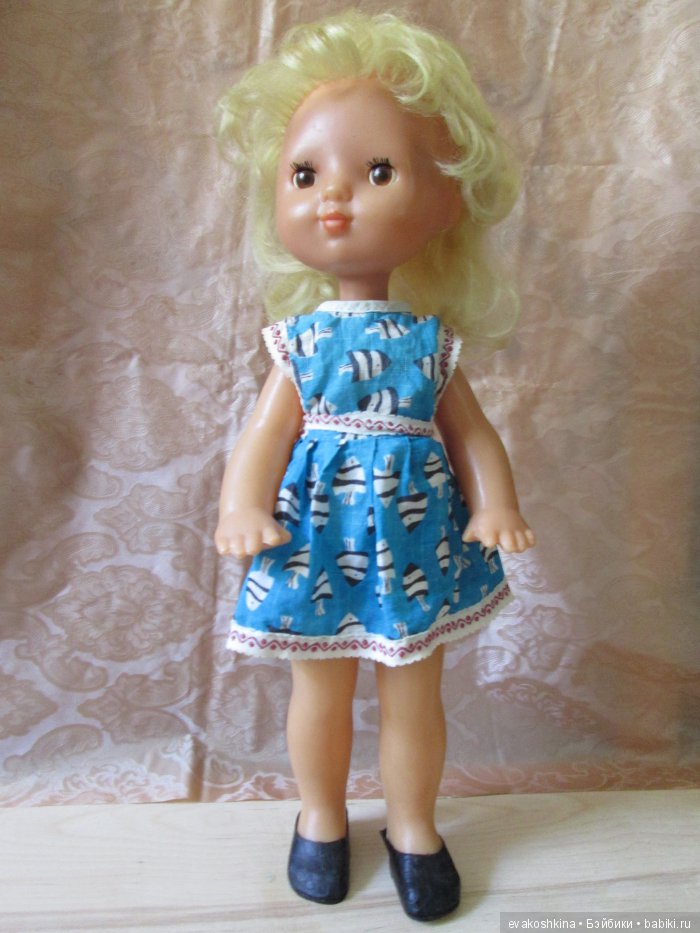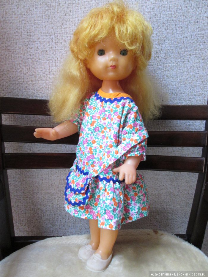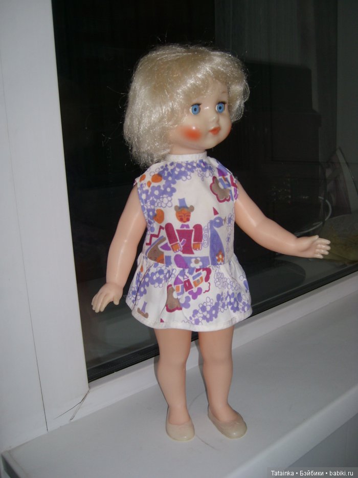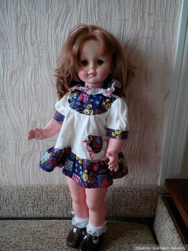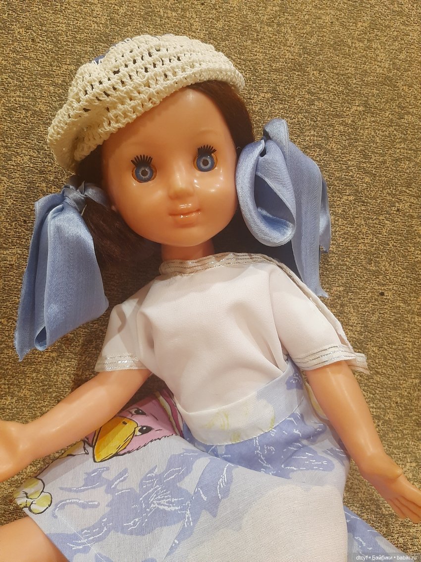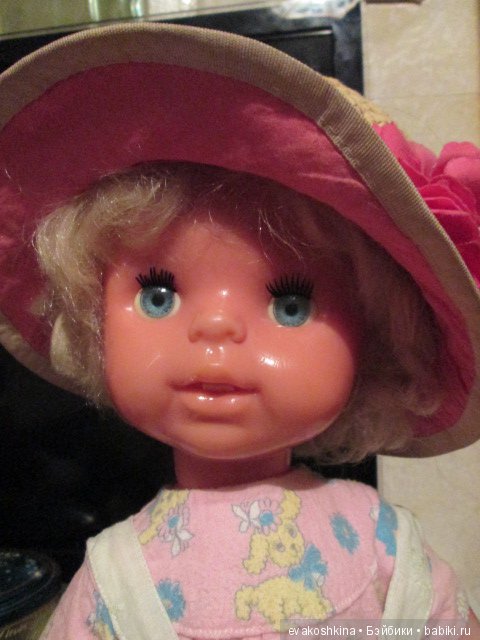 А у меня в детстве была кукла-флиртушка с глазками светло-карего цвета, примерно 60 см. Блондинка с короткой стрижкой, с прямыми ногами, но без «ходячего» механизма. Одета была в красно-коричневый шелковистые костюмчик с шортами-фанариками, а на кофточка, которая застёгивалась сзади на пуговицы тоже были рукавчики-фонарики и белый воротничок. Еще была панамка и на ногах белые пластиковые туфельки и белые носочки. К сожалению не сохранилось ни одного фото с этой куклой ((( А так хочется хотя бы увидеть такую куклу, узнать кто она и откуда…