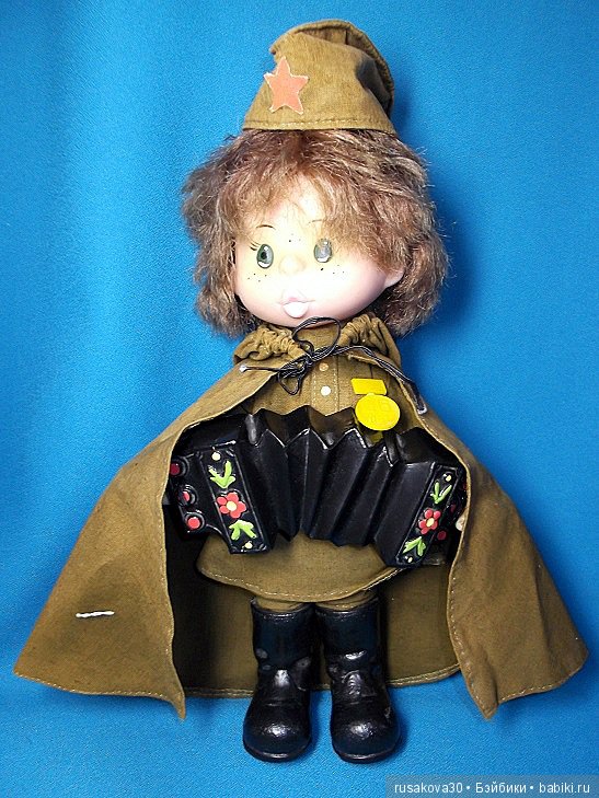 У куклы утерена медать и гармонь.