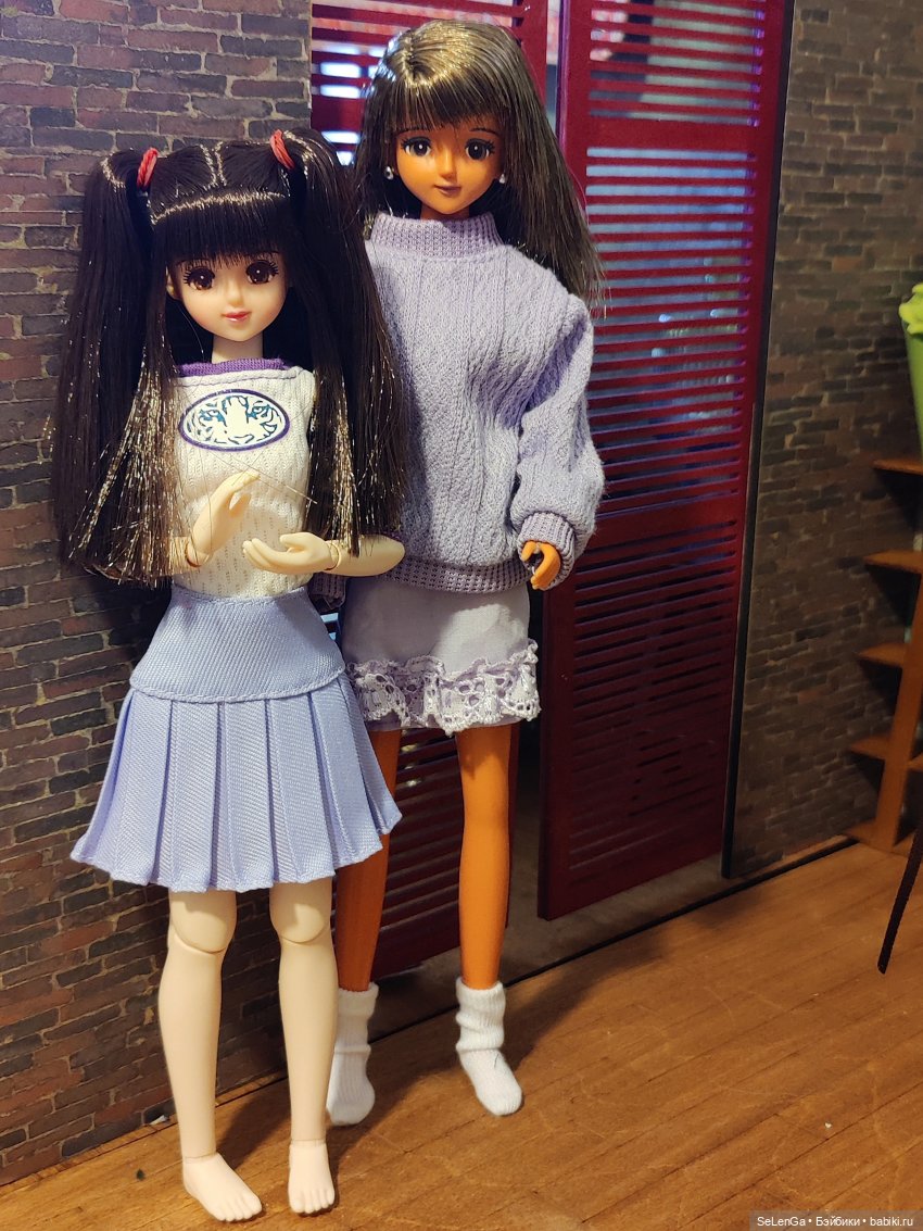 Момоко идентична по росту Элли (в сиреневом) и голова чуточку меньше.