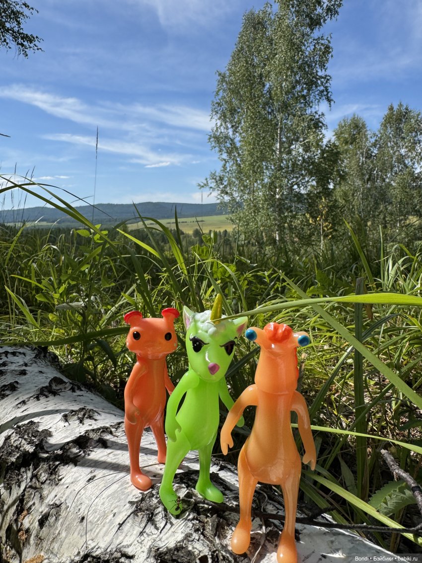Добрый день. Люблю гулять летом по лесам, с собой взяла новеньких моих жителей. Это троица из фантазийного леса из Японии от studiо uoo. Приехали на пмж к Костику и Кристаллику😊. Малыши легкие, тактильные, приятные и удобный формат. Муха слева(грибной житель), в середине Лучик(единорог) и Лаки(креветка):
