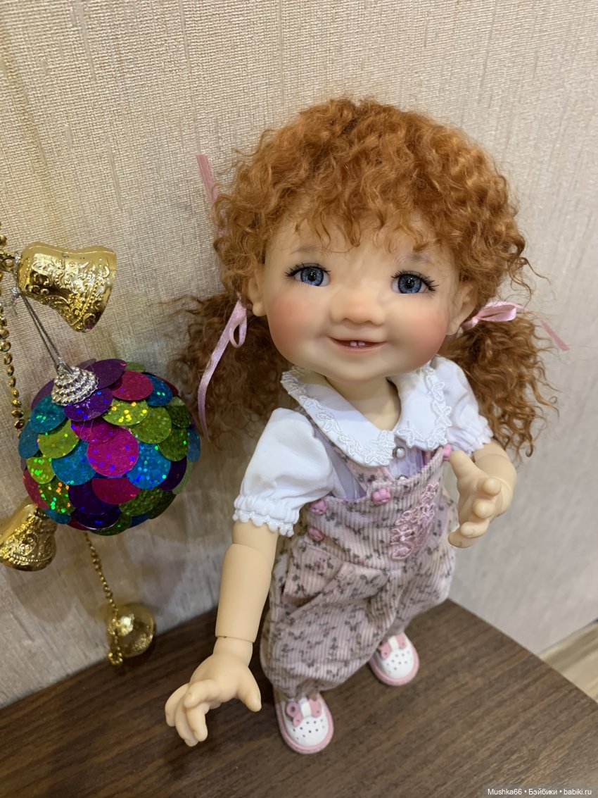 Зеленоглазая рыжулька, родилась в 2009 году, ООАК в единственном экземпляре; ростиком 70 см; шикарная, натуральная шевелюра, паричок; глазки-стекло Лауша; в ушках маленькие серёжки; оригинальный наряд из натуральных тканей, особенно я в восторге от маленьких кроссовок, а ещё у нас есть чемоданчик с медвежонком:)