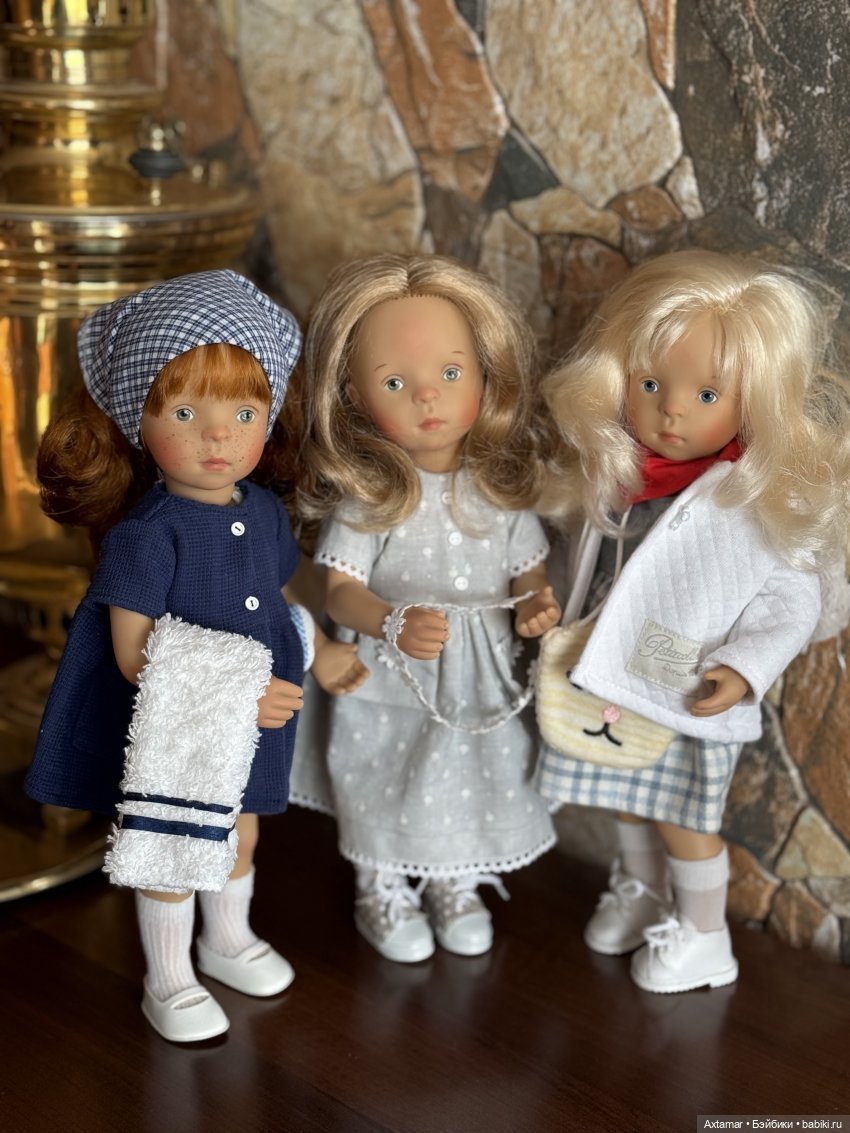 А ещё на первой фотографии Сильвии у Минуш (которая в центре в розовой шапочке) глазки как будто смотрят в сторону. Может быть, Сильвия задумала кукол Минуш с таким взглядом? Надо будет у неё поинтересоваться.