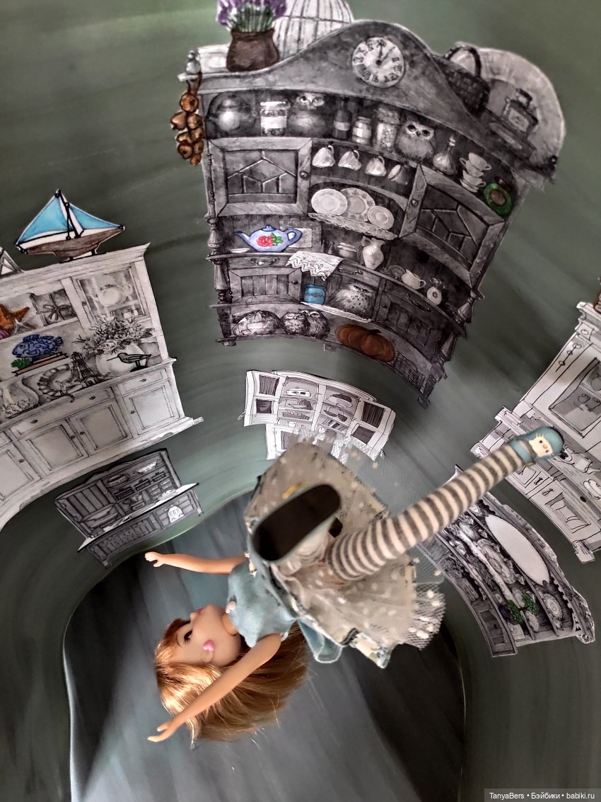 Первым делом она, понятно, поглядела вниз и попыталась разобрать, куда она летит, но там было слишком темно; тогда она стала рассматривать стены колодца и заметила, что вместо стен шли сплошь шкафы и шкафчики, полочки и полки; кое-где были развешаны картинки и географические карты.