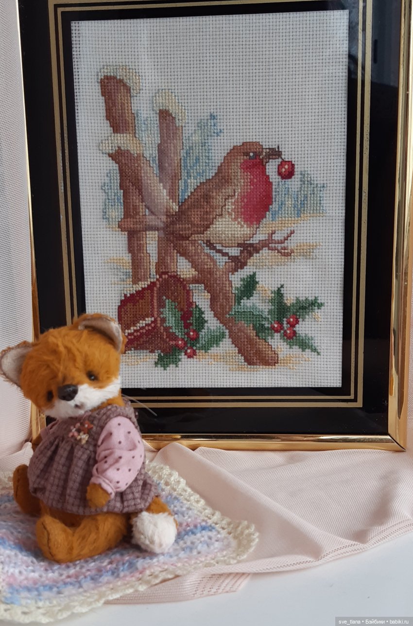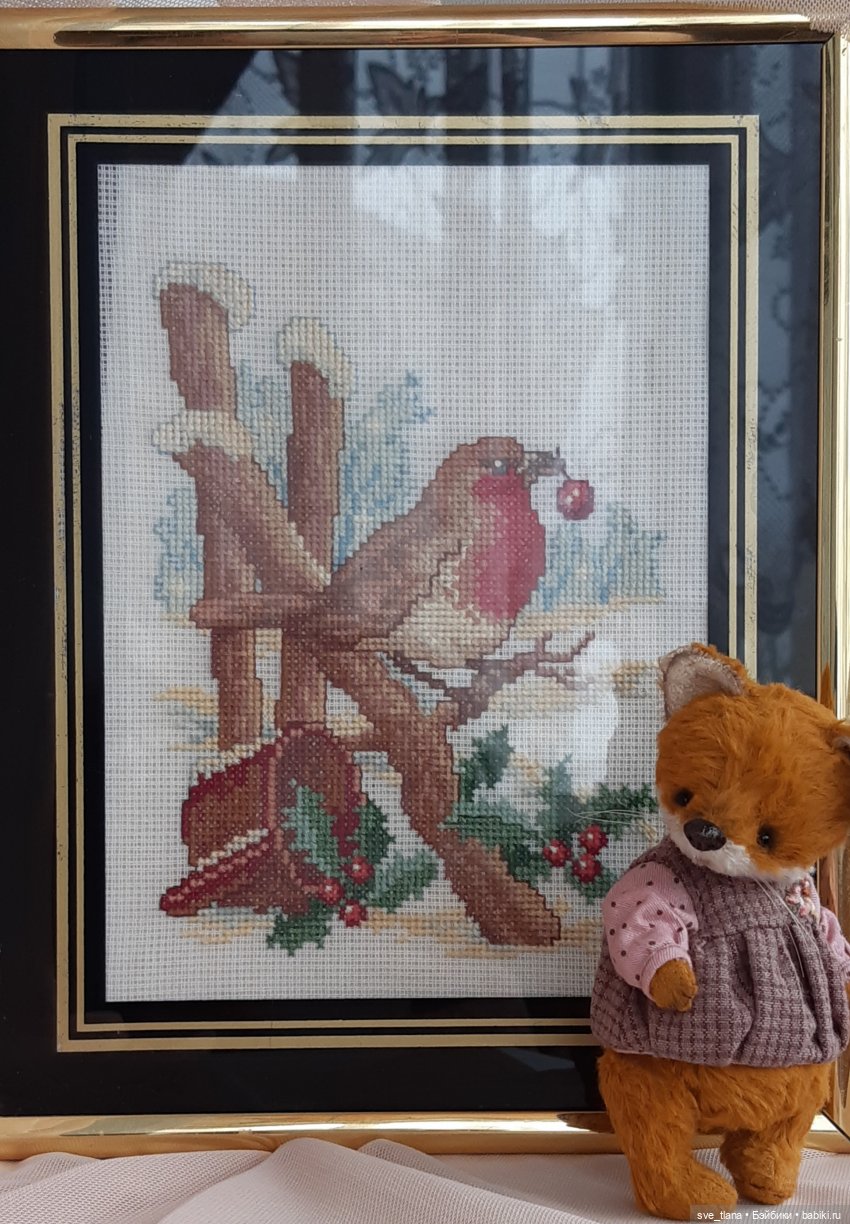 Я тут фотографировала вышитых снегириков в один топик, так эта шустрячка тоже пристроилась, хоть и не приглашали
