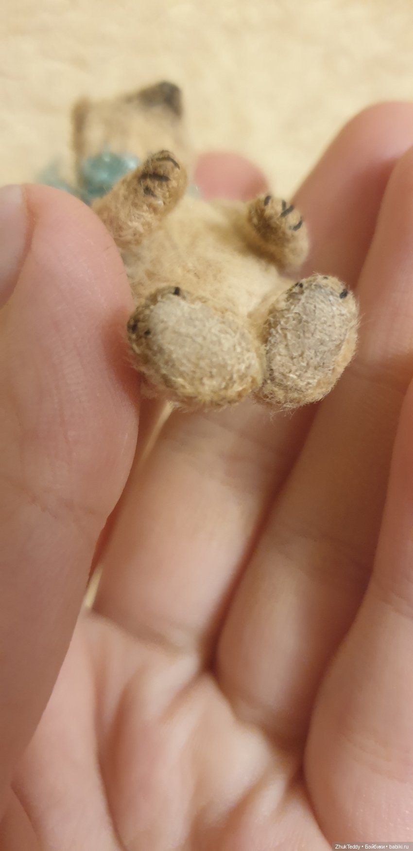 Приветствую, Вас! Хочу показать вам, как под новый год родился такой маленький мишутка ростом всего около 4см сидя), сшила я его из вискозы, наполнила опилочками-всё как положено, шплинтовое крепление головы и лап). Самое смешное, что я больше времени потратила на поиски частей тела, они все время терялись в коробочке 20×30). Фото деталей такого же мишки, чтобы был виден размер