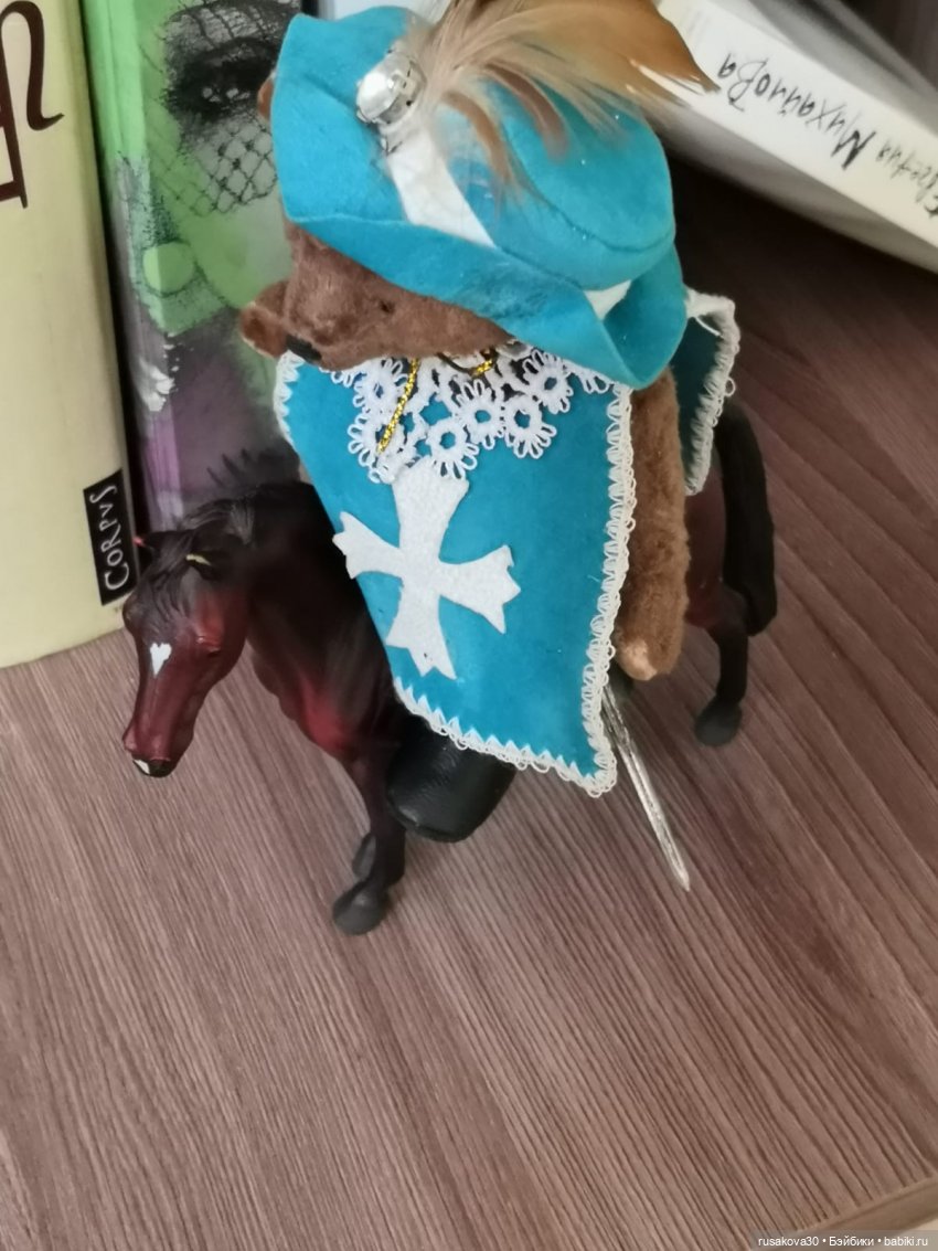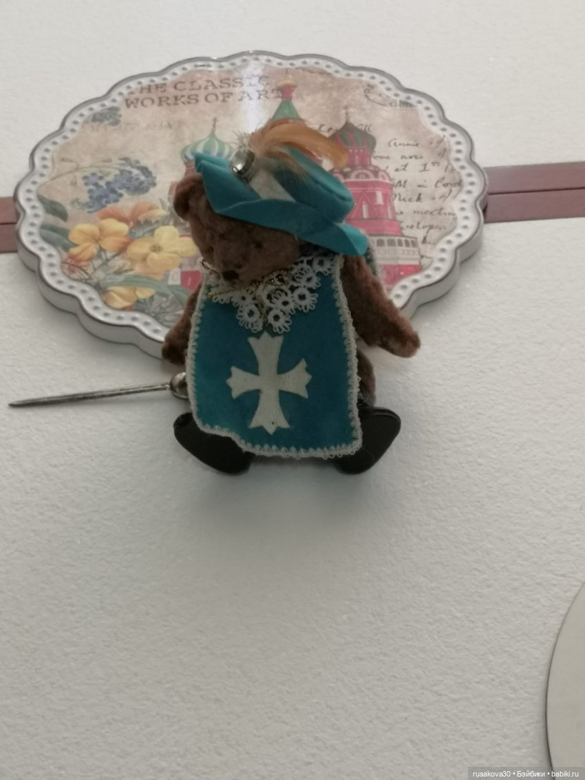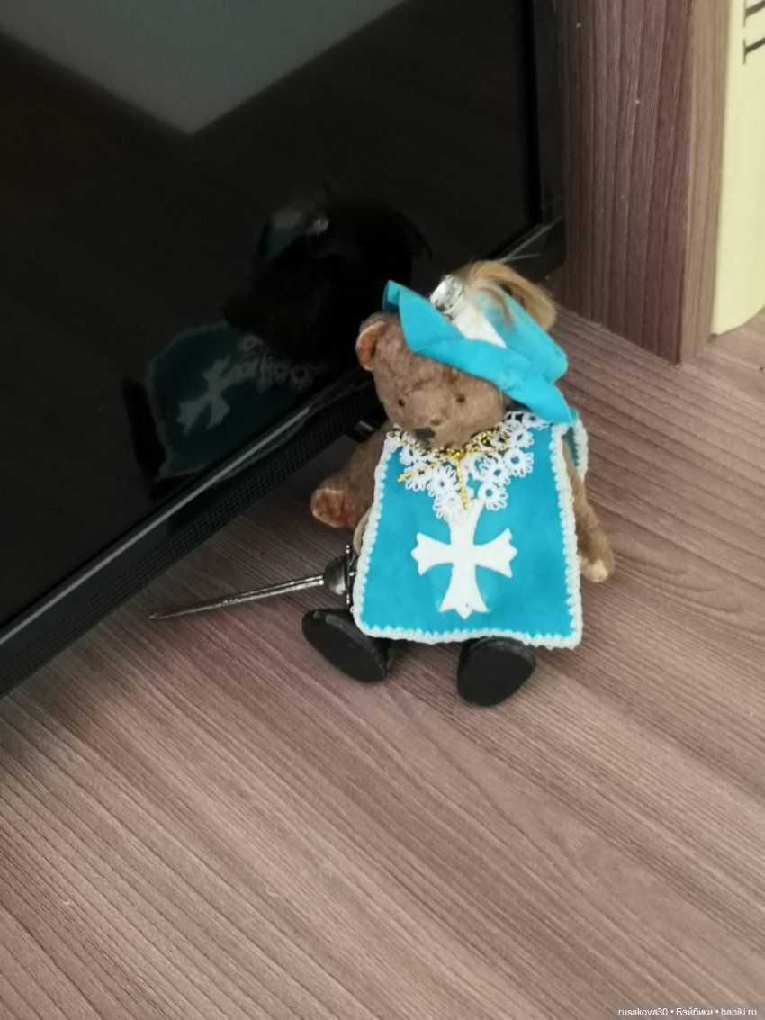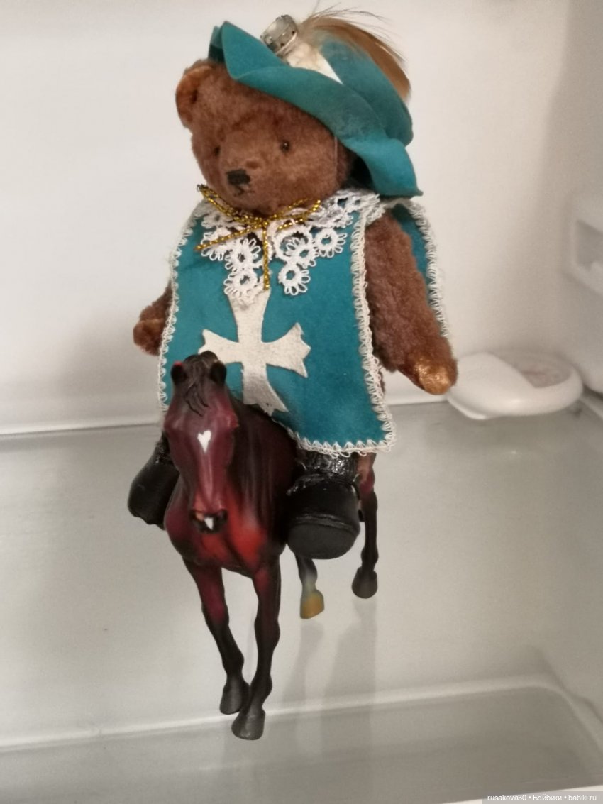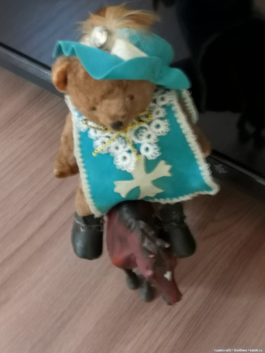 «Здравствуйте Марина, с удовольствием наблюдаю как живут Ваши игрушки. Можно подарить Вам медвежонка Тедди в образе Д,'Артаньяна.? Это авторская игрушка, Дартаньян скучает по Англии. Ему срочно нужно попасть в дворец Бекингема 🤣🤣Он малыш, места много не займёт, на лапки ему обула ботинки с елочками(российский Д'Артаньян, в них он стоит хорошо. К нему прилагается шпага(какой же Д'Артаньян без шпаги) металлическая. Будет защищать Ваших Машек😃. Ну если да ваш адрес на русском и английском языке. С уважением Наталия.