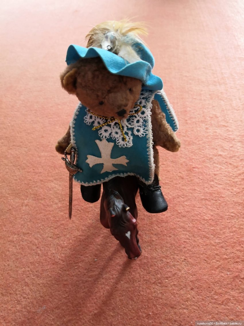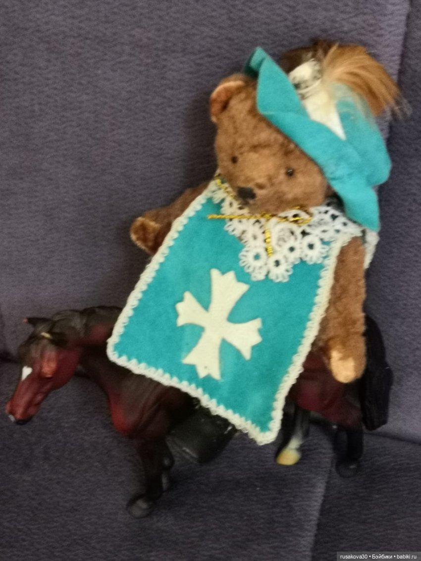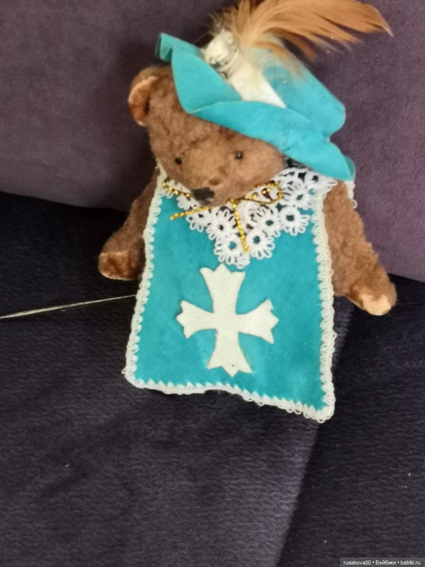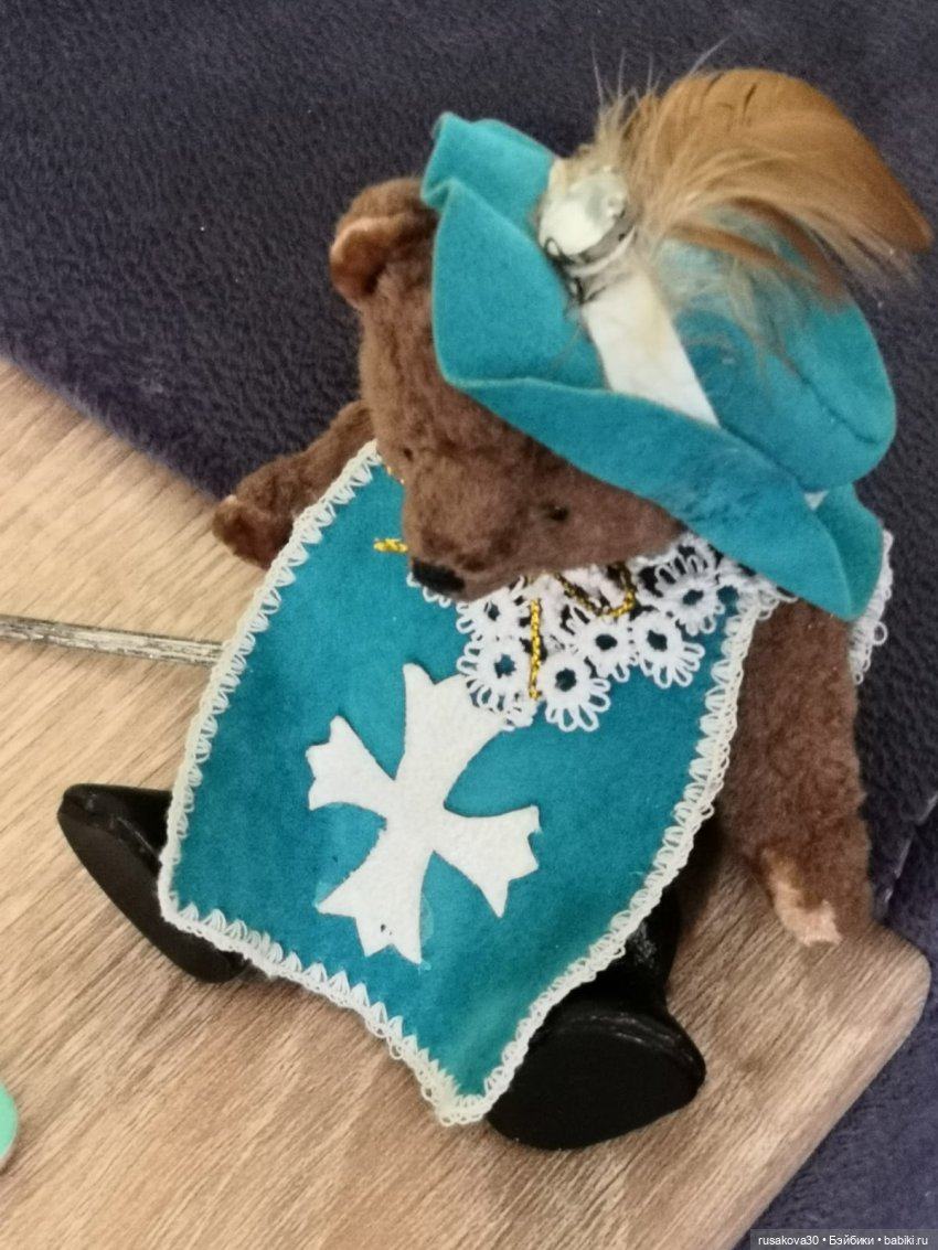 «Здравствуйте Марина, с удовольствием наблюдаю как живут Ваши игрушки. Можно подарить Вам медвежонка Тедди в образе Д,'Артаньяна.? Это авторская игрушка, Дартаньян скучает по Англии. Ему срочно нужно попасть в дворец Бекингема 🤣🤣Он малыш, места много не займёт, на лапки ему обула ботинки с елочками(российский Д'Артаньян, в них он стоит хорошо. К нему прилагается шпага(какой же Д'Артаньян без шпаги) металлическая. Будет защищать Ваших Машек😃. Ну если да ваш адрес на русском и английском языке. С уважением Наталия.