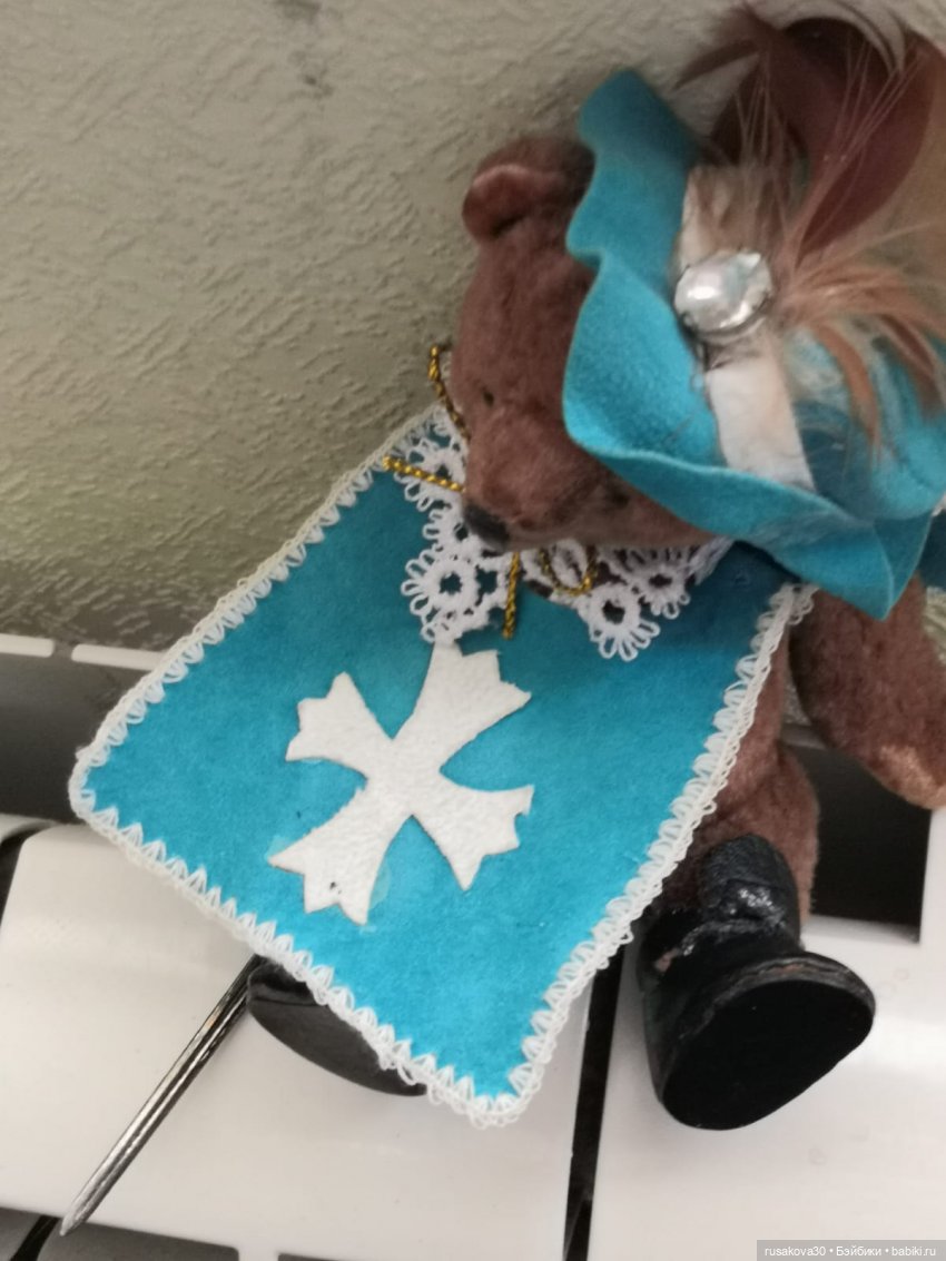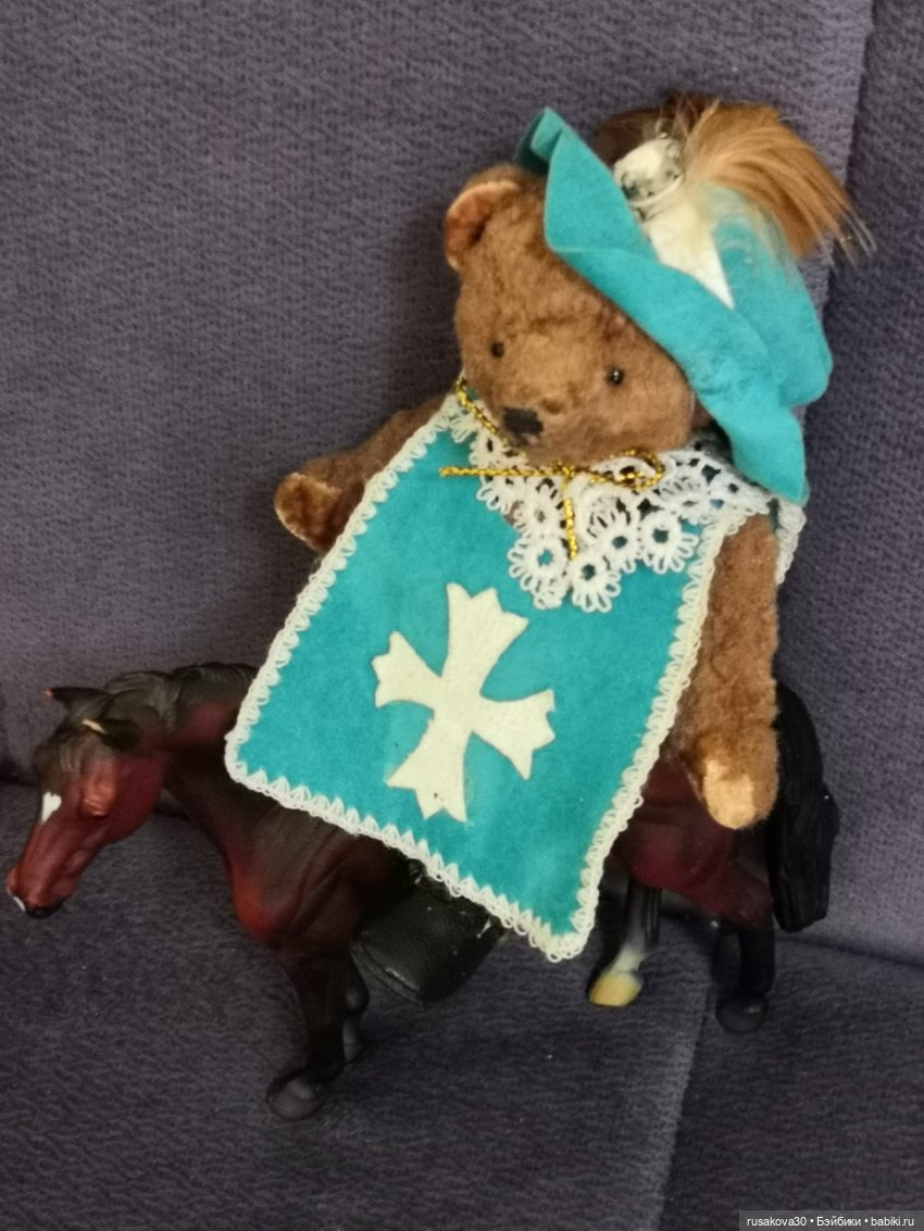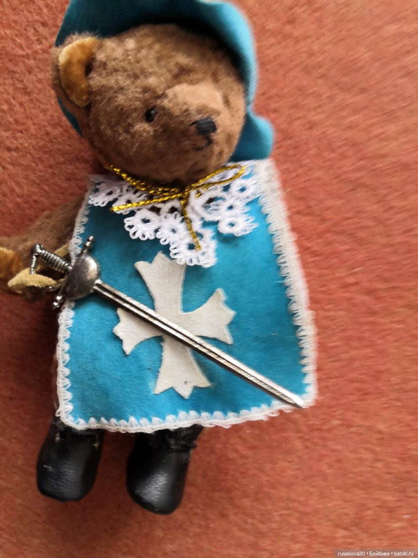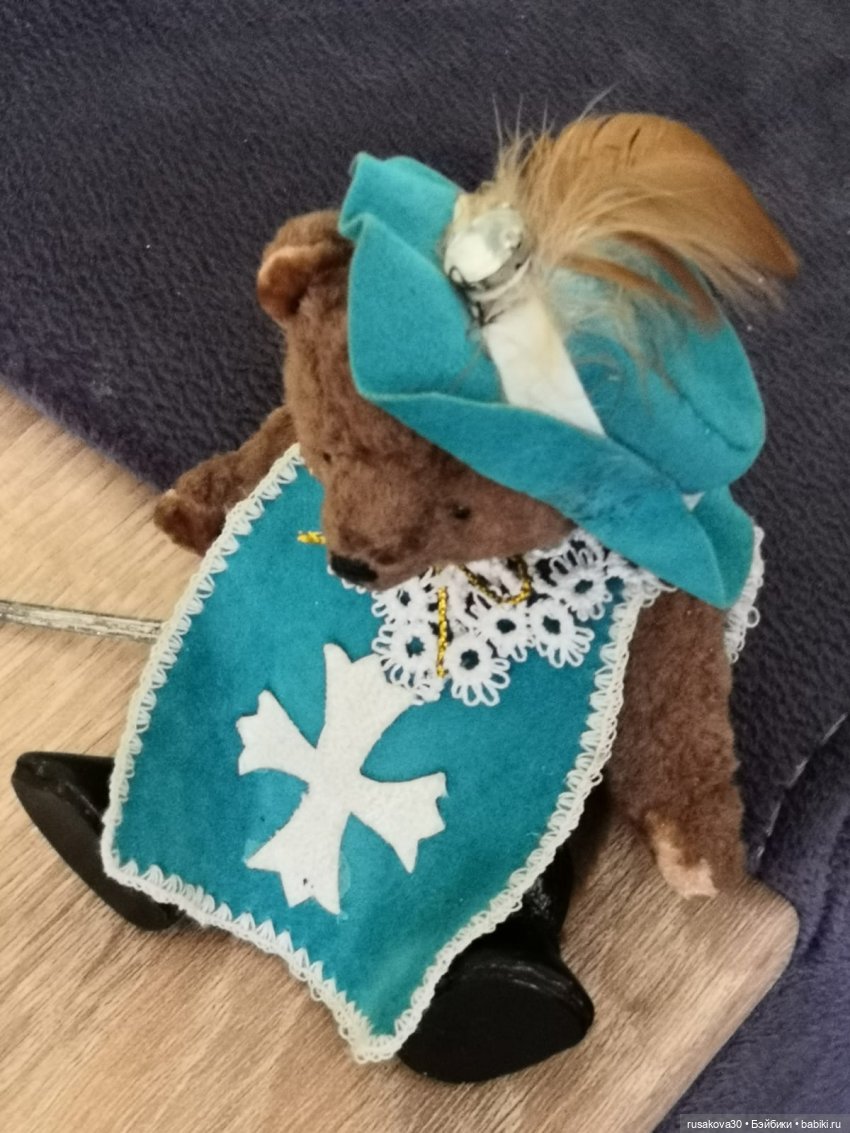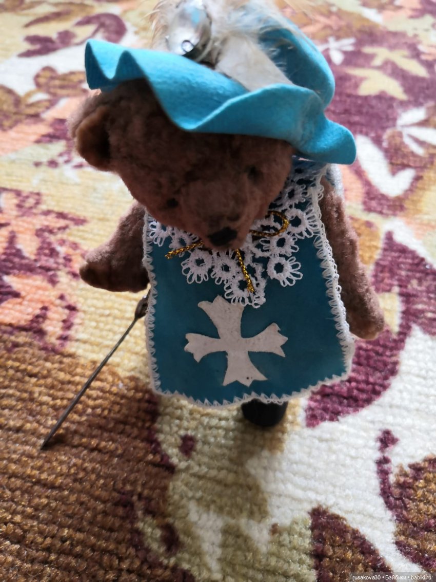 «Здравствуйте Марина, с удовольствием наблюдаю как живут Ваши игрушки. Можно подарить Вам медвежонка Тедди в образе Д,'Артаньяна.? Это авторская игрушка, Дартаньян скучает по Англии. Ему срочно нужно попасть в дворец Бекингема 🤣🤣Он малыш, места много не займёт, на лапки ему обула ботинки с елочками(российский Д'Артаньян, в них он стоит хорошо. К нему прилагается шпага(какой же Д'Артаньян без шпаги) металлическая. Будет защищать Ваших Машек😃. Ну если да ваш адрес на русском и английском языке. С уважением Наталия.