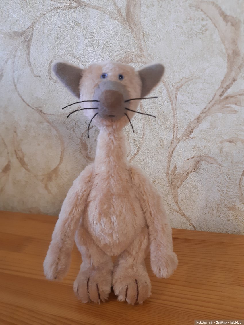 21 см сшит из немецкого мохера, набит опилками, утяжелен минеральным гранулятом, глазки — стекло, лапки и голова на шплинтах. Второй из трех запланированных)