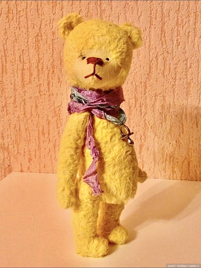 Мишка тедди. Рост ~ 18 см. Сшит из вискозы. Голова и лапки подвижные. Самостоятельно сидит и стоит. Получил имя Лимончик.