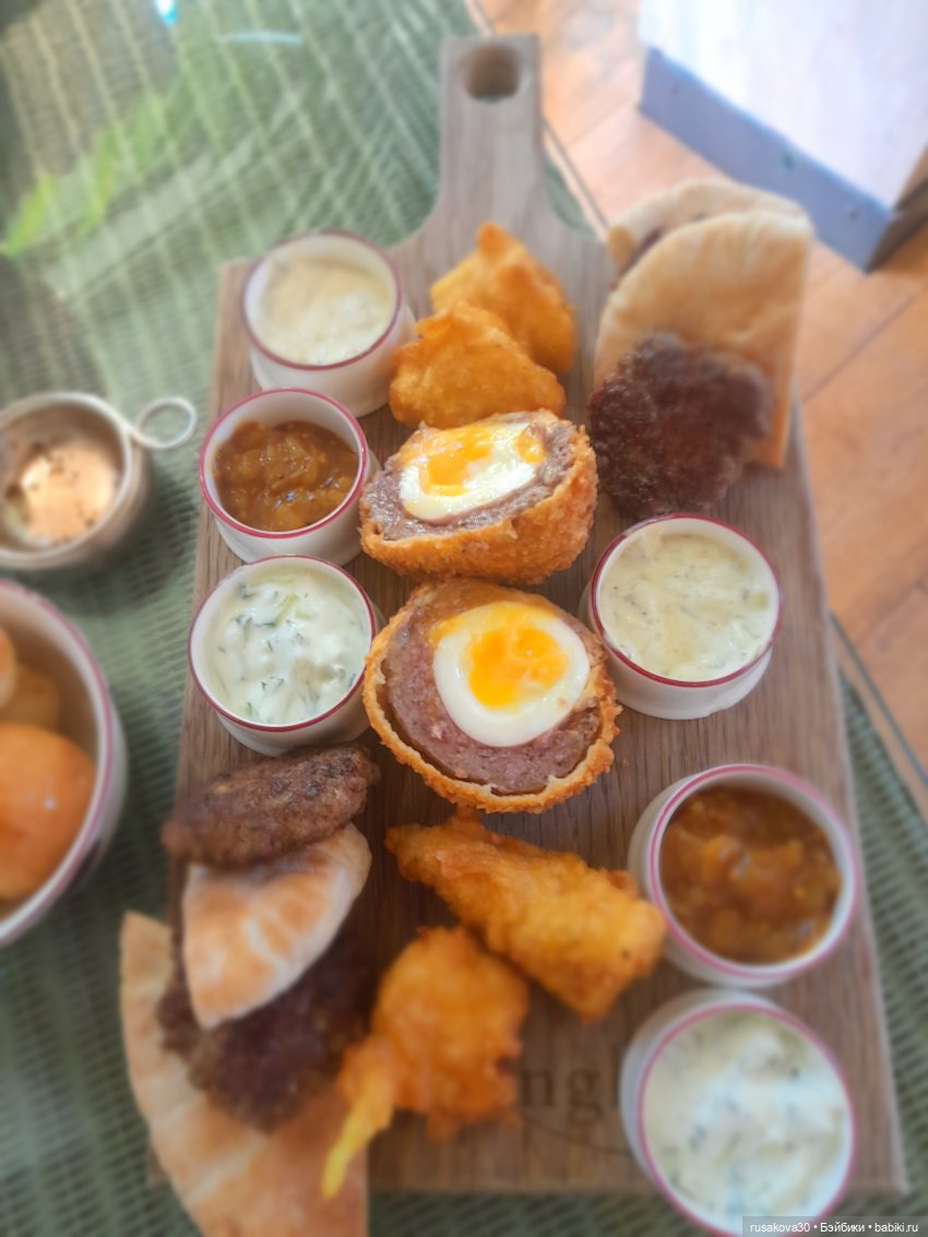 Котлетки, картошечка, креветки в тесте, шотландское яйцо и три вида соуса.