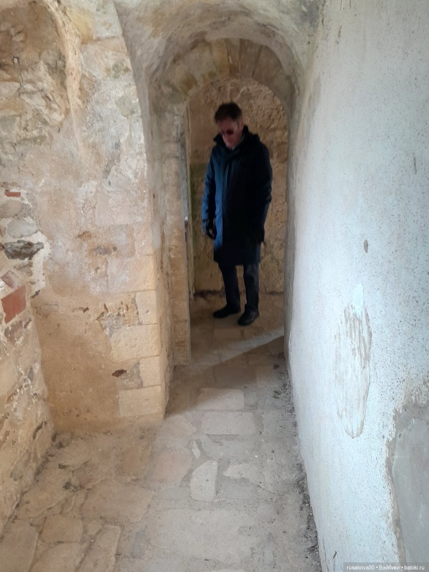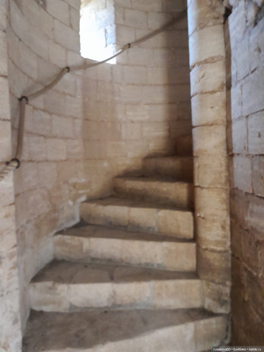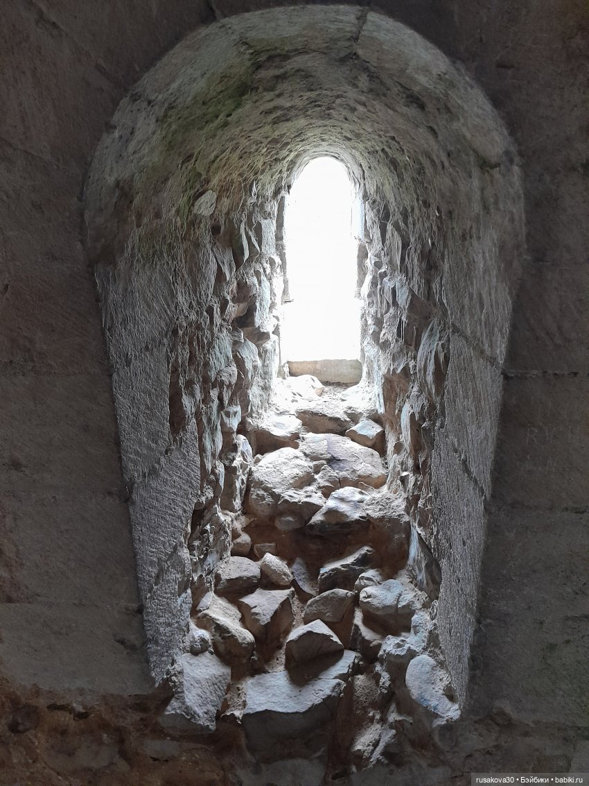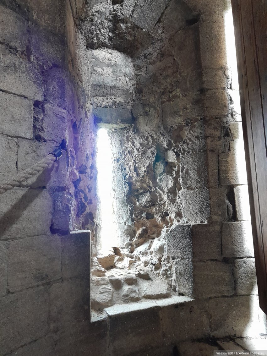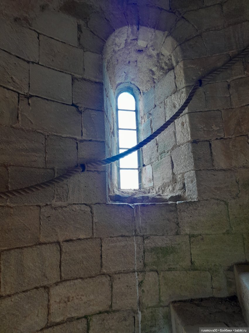 Архитектура замков везде немного похожа) Был в Олесском замке, это недалеко от Львова, ещё когда весь этот дурдом не начался, давно. Так вот — там такие же узкие винтовые лестницы, узкие проходы, бойницы, толстенные стены. А делалось это всё для обороны. По такой лестнице может пройти только один человек. Если наверху лестницы стоит один защитник, он довольно долго может эту лестницу оборонять даже от десятка нападающих, которые прут снизу, потому что толку от этого десятка — всё равно больше одного в ряд не помещается))) Разве что друг друга и потопчут))) И коридоры для того же узкие, и окна — чтобы ничего лишнего не влетело и враг никакой не влез, а если лезет — можно было бы его чем-то длинным беспроблемно обратно вытолкнуть без риска для себя. Подозреваю, что и дверные проёмы тоже по этой же причине такие низкие.