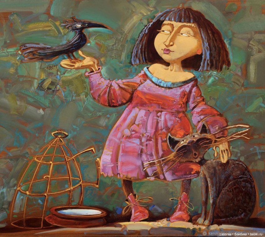 Картина К.Канский «Птица, девочка и кот»