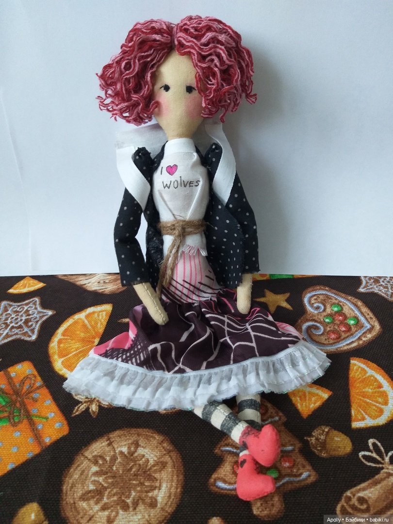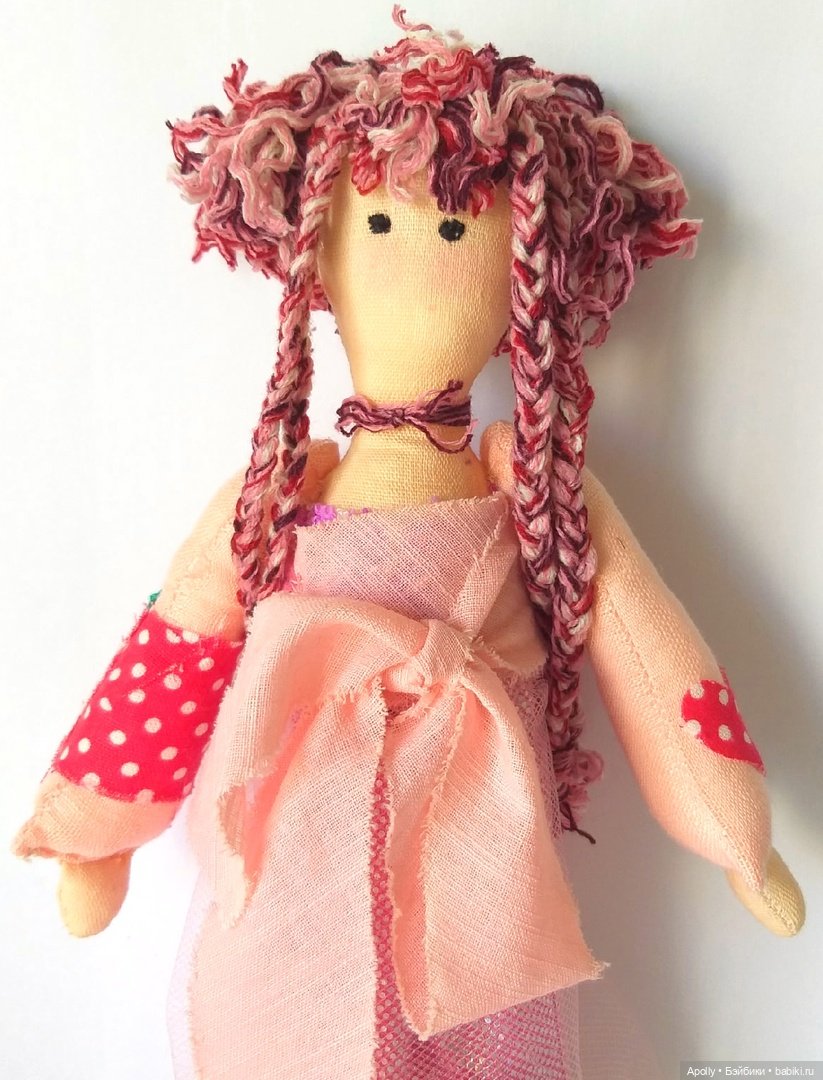 С этой куколкой вообще постоянно странности у меня. Я помнила, как выполняла некоторые этапы работы, но через какое-то время они оказывались не начатыми. Её имя — просто название цвета. Когда я ездила на ярмарку со своими куклами, то её купила одна женщина для своей дочки, имя, историю, образ девочка не знала, но женщина написала мне, что куколка была названа Мисс Пурпур...