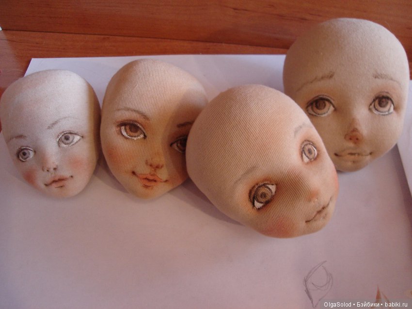 Так как кукла предназначалась для девочки 5 лет, то решила делать ее в технике грунтованного текстиля, что для объемных личиков даже лучше — покрыла все открытые участки кожи смесью ПВА, грунта и акриловых красок. Поверхность получилась очень интересной и приятной на ощупь.Личико расписывала акриловыми красками.