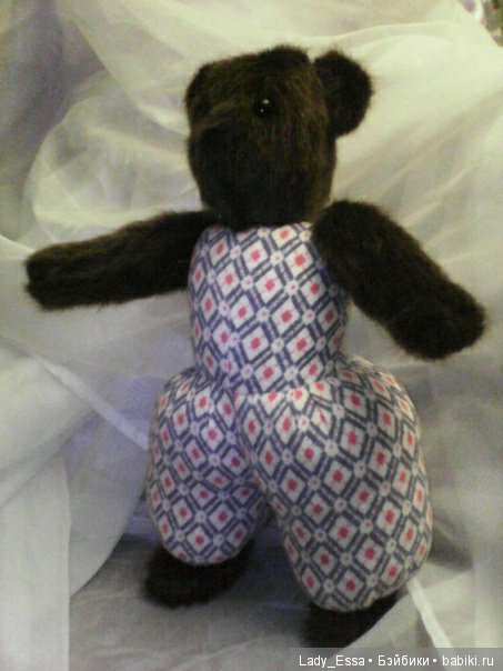 Самый маленький мишка из набора «Шейте сами», и с 1977 года он был выкройкой. В наборе были скроеные меховые детали, глазки и носик. Потом этот набор достался мне, и я сшила мишку и сделала ему поворотную голову.