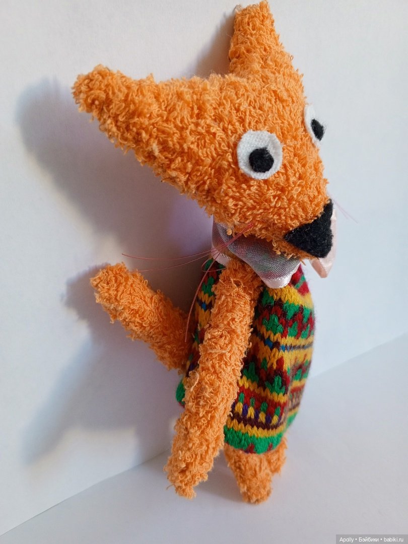 Эта лисичка мне видится самой младшей из трёх, она очень любопытная, ей всегда всё интересно. Лиска смотрит то туда, то сюда, и стремглав бежит в ту сторону, где замечает что-то интересное.Как младшенькой, мне хотелось завязать ей бант на голове, но она заявила, что хочет видеть его только на шее, поверх свитера. Это её стиль. А потом убежала терроризировать кота. Гиперактивный ребёнок, что с неё взять.