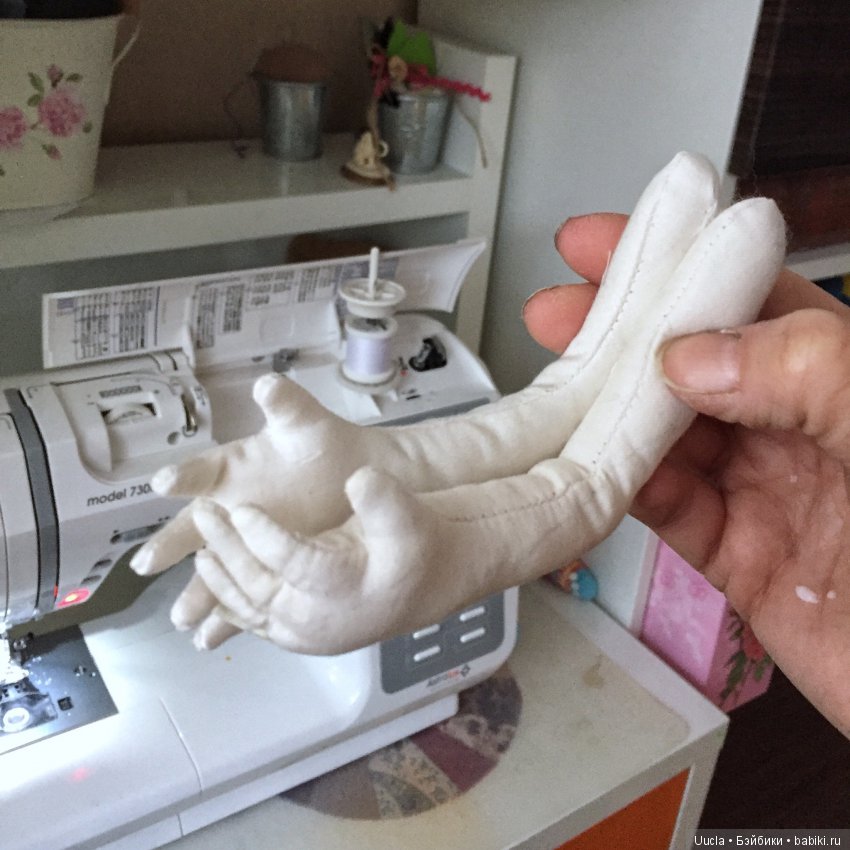 я оставляла небольшой разрез незакрытым -от кисти-до локтя, для того, что бы облегчить набивку ладони и пальцев. потом и его зашивала зигзагом. Как „набивала пальцы“… попробовала синтепоном… какие-то сосиски… и тут меня осенило… на столе лежали ватные палочки на пластиковых трубочках… размерчик самое то! отрезаем и вставляем в пальцы!