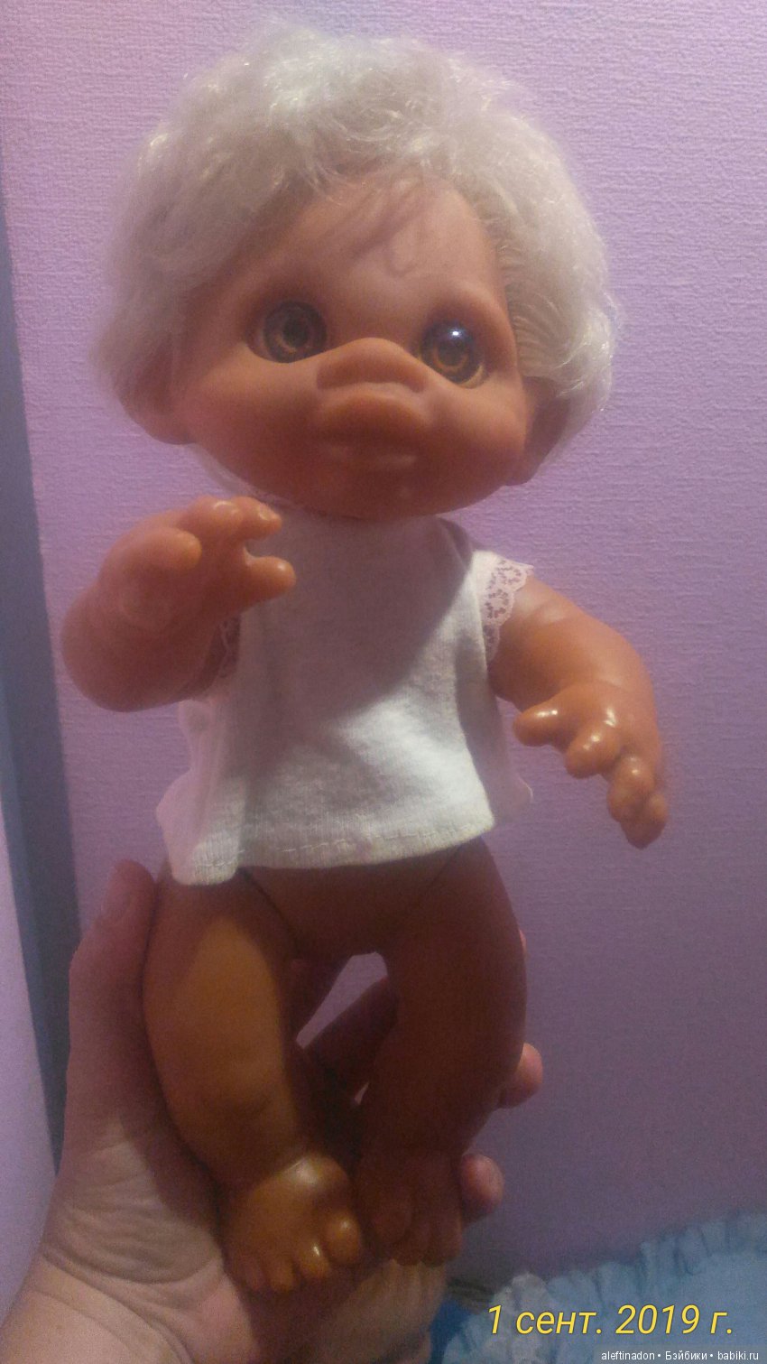 Нам досталась куколка с проколотыми мочками ушек. На днях подберем ей сережки, чтобы закрыть эти дырочки.