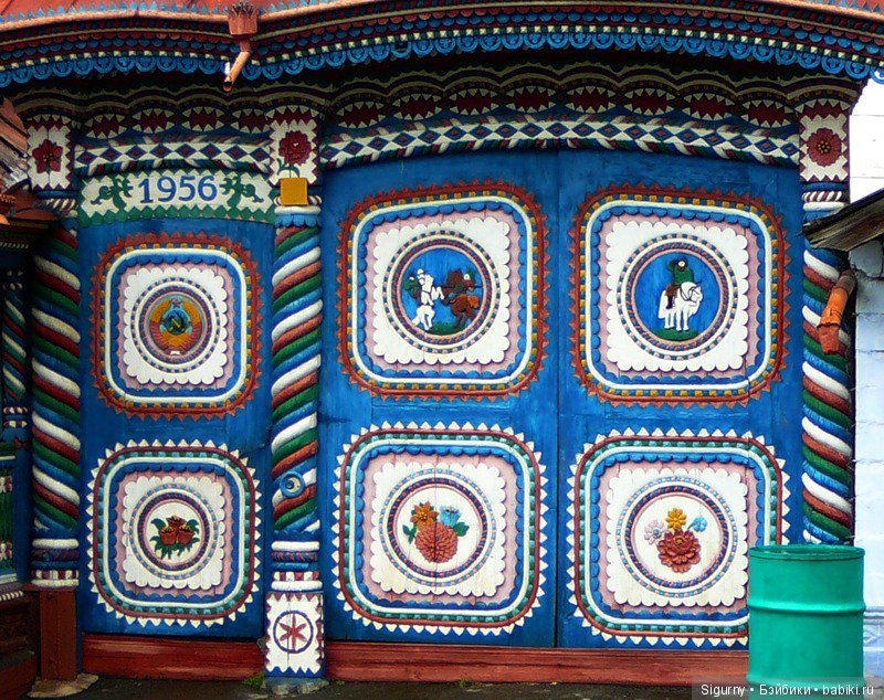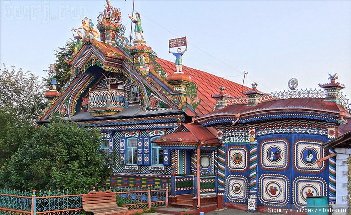 В 1999 году этот дом признали лучшим в России! Он победил во всероссийском конкурсе самодеятельного деревянного зодчества. Чего на нем только нет! Дети, всадники на конях, ракеты, голуби, символика СССР, солнце, богатыри, различные фразы и другие разнообразные украшения. Но самая распространенная тема – цветы и различные завитушки.