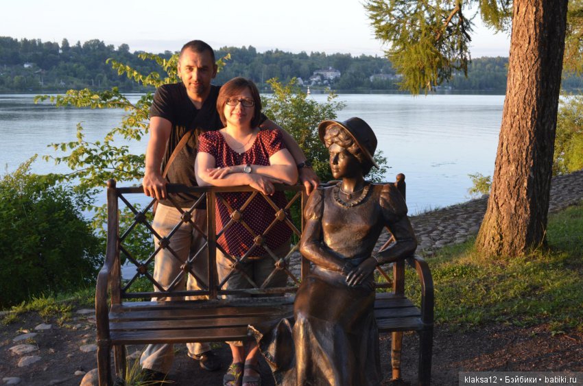Набережная оживилась. Появились интересные туристические приманки. Можно сфотографироваться со скульптурой под названием «Дачница» (говорят прототипом стал образ спутницы Левитана Софьи Кувшинниковой). Ниночка воспользовалась таким шансом. А через прозрачный мольберт можно любоваться «живой картиной» Вид на Волгу (она меняется каждые 5 минут) или можно самому вписаться в раму! Еще есть памятник кошке Мухе. К памятнику прилагается трогательная легенда. Правда или нет, не знаю, на то она и легенда.