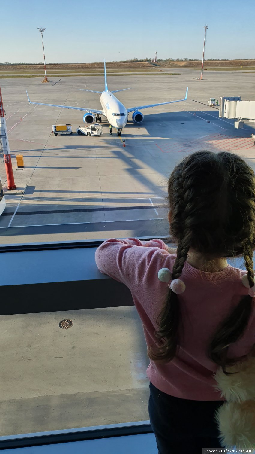 Сначала в кафе аэропорта. Даже воробушка нашла и покормила. В зале ожидания привлекла к себе внимание пассажиров. Потом в самолёте скакала возле иллюминатора. Ну а когда прилетели началась суета и фото делать некогда.