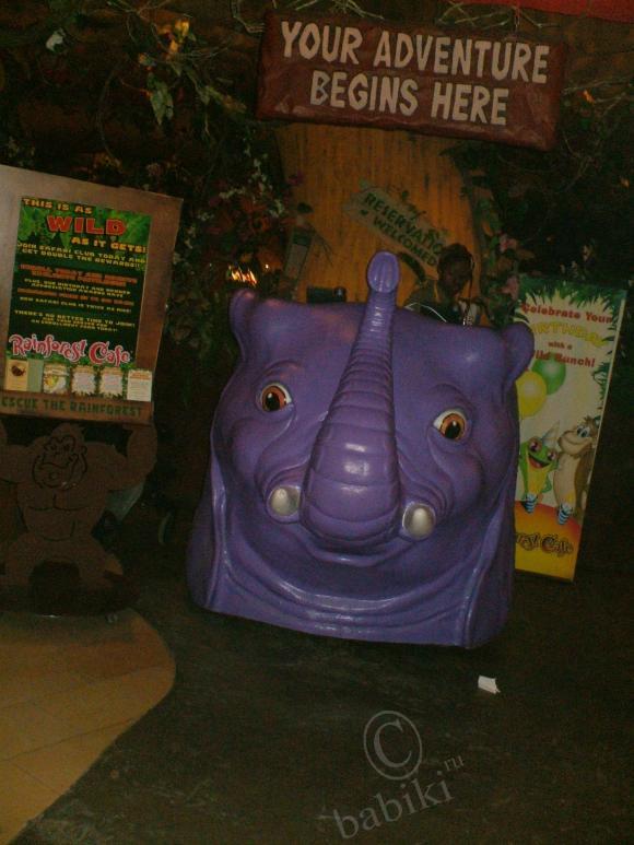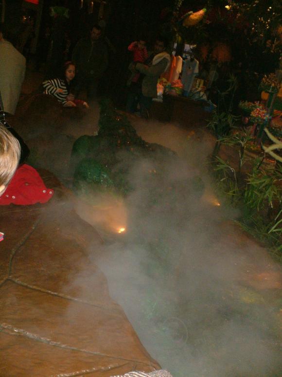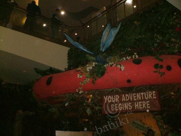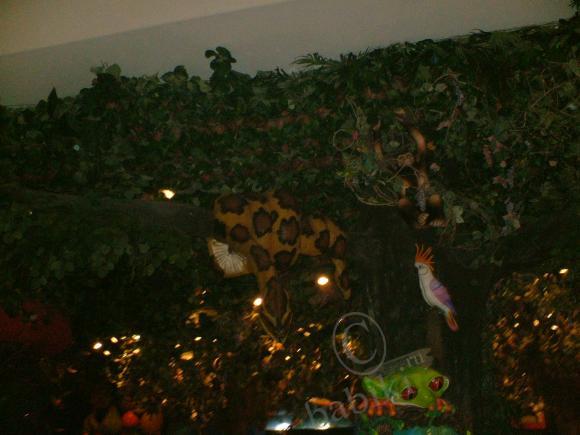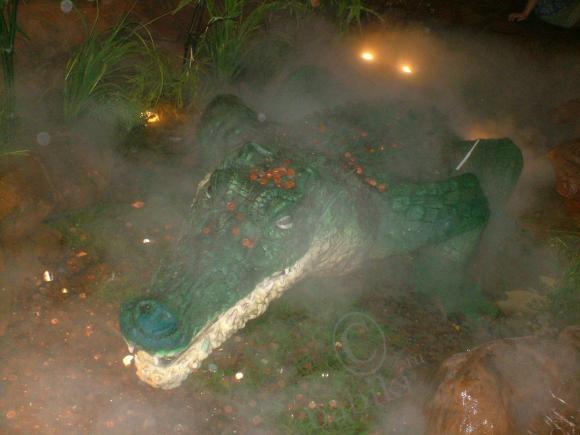 Это уютный уголок отдыха в дальнем конце молла — кусочек джунглей. Искусственный пруд с растительностью, подсветкой, искусственным туманом, каменным парапетом, на котором удобно сидеть и… громадным крокодилом — почти живым!) Чудище имеет механизм для перемещения по бассейну (ползает резво, ещё как!) И угрожающе рычит — довольно натурально.