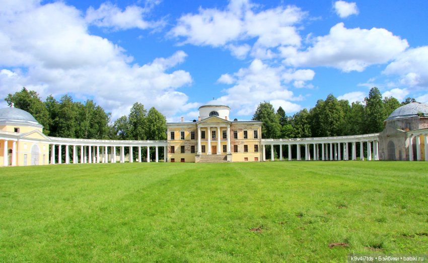 Усадьба находилась в двух верстах от государевой дороги, Петербургского тракта, от которого подъездная аллея приводила гостей к триумфальной арке ворот. Изящные каменные вазы аттика и растительный орнамент кованой чугунной решетки ворот перекликаются с окружающей природой. По обе стороны от ворот расходится колоннада, охватывающая огромный овальный парадный двор, напоминающий древнеримский форум. Колоннада, эта „белая сказка колонн“, украшает господский дом как ожерелье, замком которого служат въездные ворота.»