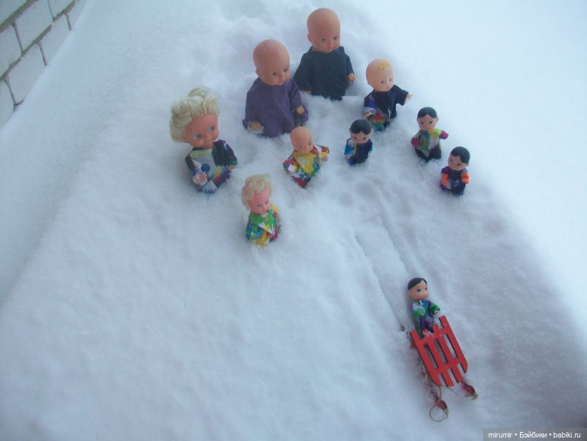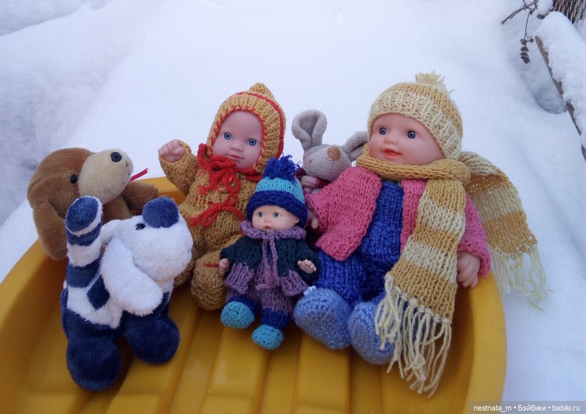 А отряд пупсят весь в форме — шапочки и комбинезончики у всех! Так гулять, конечно, можно! Даже рукавички у них имеются! Здорово!