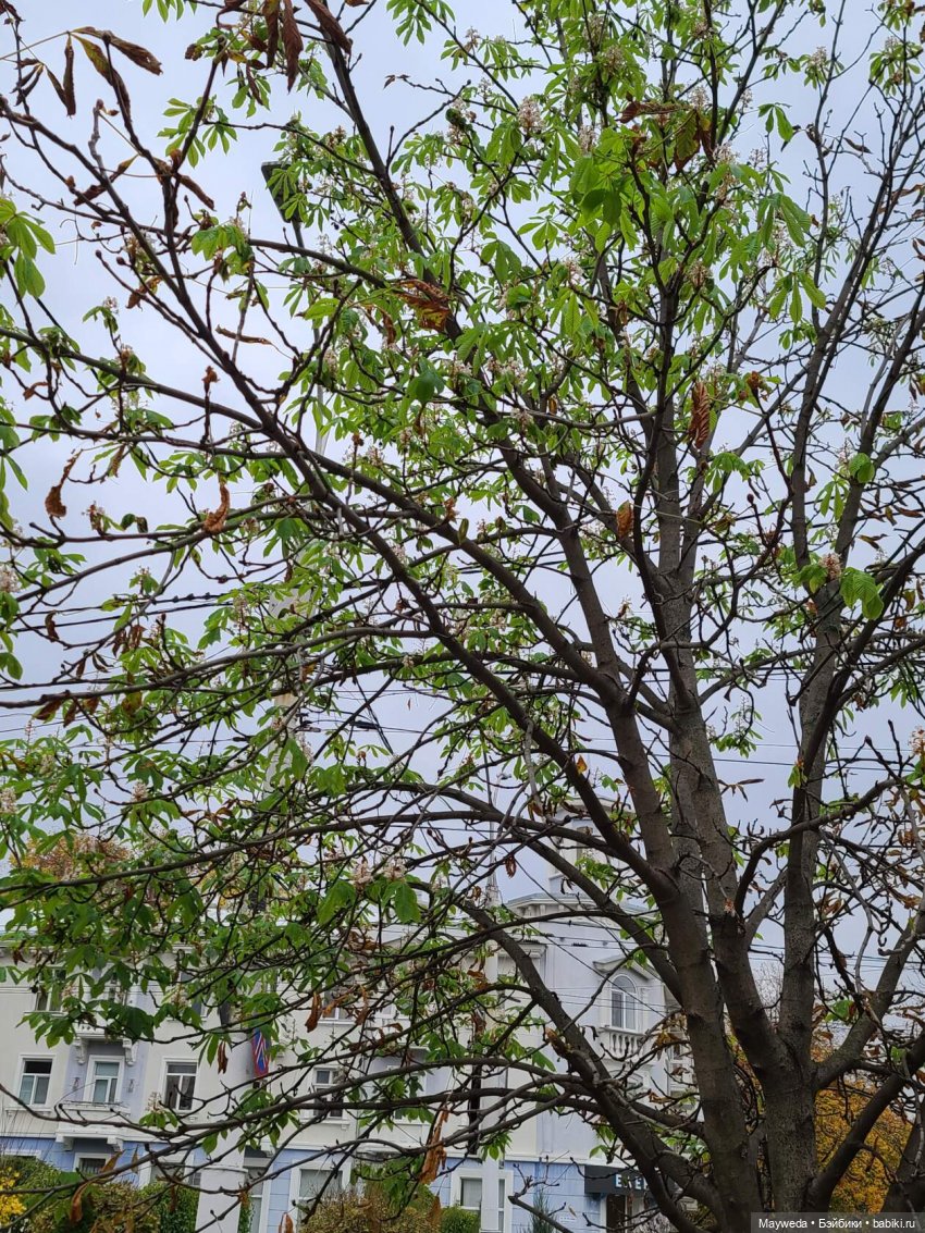 Вот это дерево, например, все покрыто осенними листьями и цветет!!! Вы когда нибудь видели такое?