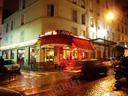 Теперь осталось только найти кафе «Две мельницы», где работала Амели. Оно находится на улице Рю Лепик, 15 (Rue Lepic). Вообще-то лучше всего идти к этому кафе от метро Бланш (Blanche), надо выйти на ту сторону, где Мулен Руж (да-да, это тоже здесь), узенькая улочка справа от Мулен Руж, уходящая чуть вверх – это и есть Рю Лепик. Пройдёте метров пятьдесят – и слева будет кафе «Две мельницы». Мы же от Трёх Братьев спустились по Рю Жермен Пилон до Бульвара Клиши и шли до Мулен Руж, а затем свернули на Рю Лепик.