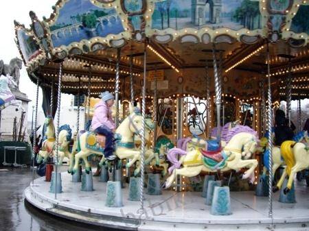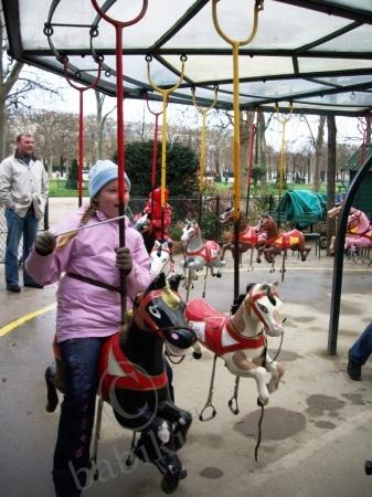 Каждому ребёнку выдаётся металлическая палочка, с помощью которой он может попытаться выдернуть закреплённые на специальной стойке металлические колечки. Правда, Лиза сначала думала, что надо просто просунуть палочку в кольцо и поймать её, но потом ей показали, что же надо делать. В результате, два кольца она всё же выдернула. Радости было – море. Карусель делает около 10 кругов за один проезд и стоит 1,5 евро. А вы говорите – Эйфелева башня. Да какая может быть башня, если рядом такая карусель!