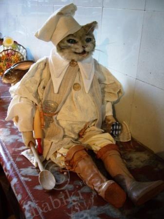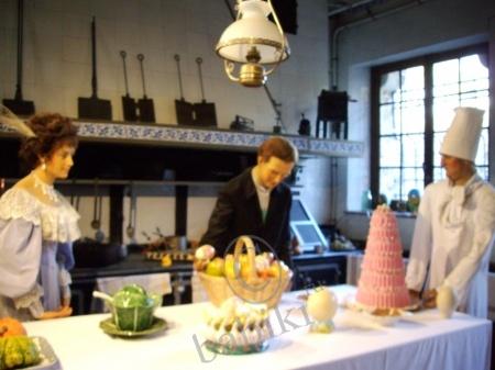Например, в одной из комнат замка есть целый кошачий оркестр – и клавесин, и скрипка, и виолончель, и арфа, и лютня (включается с помощью выключателя справа на стене, что было многократно проверено Лизой). На кухне рядом с поварами сидит Кот в поварском колпаке и со скалкой в руках. Сабина рассказала, что в этой же комнате расположены два лифта, они предназначены для подъёма в столовую замка готовых блюд и спуска вниз грязной посуды. В кухне и столовой сохранены подлинные предметы быта (плита, кастрюли, котлы, утварь) и мебель, разумеется, эта часть здания тоже очень понравилась моей дочке.