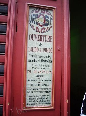 Музей расположен на улице Сен Поль (rue Saint Paul, 11, в подвале), на табличке надпись Academie de Magie. Работает только три дня в неделю, среда, суббота и воскресенье, с 14:00 до 19:00. Посетителей – море, так что если хотите всё как следует рассмотреть, приходите к открытию. Когда подняли жалюзи, закрывающие вход (мы, разумеется, стояли первые), то нашим взорам предстали – шкаф с автоматическими игрушками, рука, вытянувшаяся из стены и перо, на котором сидит малюсенький чертёнок, само выводящее слово «входите».