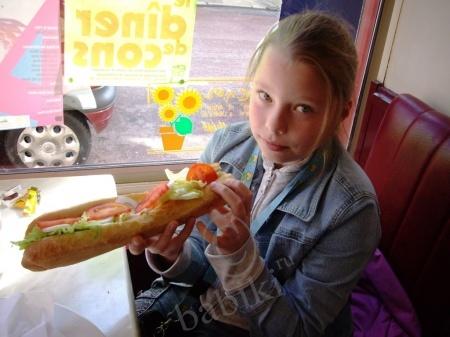 Мы решили скромненько перекусить и заказали сэндвичи, Лизе с ветчиной, а нам с тунцом. Но то, что нам принесли, я бы не назвала скромным перекусом туриста, скорее, обедом обжоры (спасибо холодильнику, сохранившему нашу еду, на второй день мы это одолели) – представьте себе половину французского багета, в котором находится не меньше банки тунца, а также сыр, пара помидор и не меньше 200 гр. зелёного салата! А я-то думала, и чего это у них один сэндвич почти на 7 евро тянет!