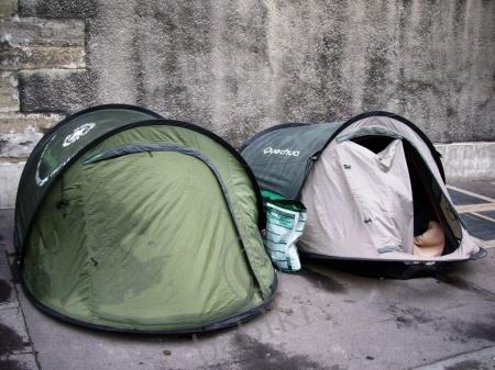 Наконец, решили обойти слева, и прямо на углу обнаружили две палатки со спящими внутри бомжами. Какие-то сумки стояли у входа, в беспорядке разбросаны вещи – полог одной из палаток был открыт, а мы оказались в меру любопытны (внутрь не заглядывали, но всё и так видно). Следующее лежбище было обнаружено нами в 500 метрах от первого, на противоположном углу школы (они там что, по всему периметру живут?), только эти уже лежали прямо на асфальте, в спальных мешках, рядом стояли сумки с каким-то барахлом и несколько бутылок горячительного (замерзают, однако, бедолаги). Мы были удивлены несказанно не то чтобы наличию бездомных в самом центре Парижа, но тому, что их никто с того места не прогонял (спустя пару дней, в понедельник, эти ребята всё ещё обитали на прежнем месте, на асфальте).