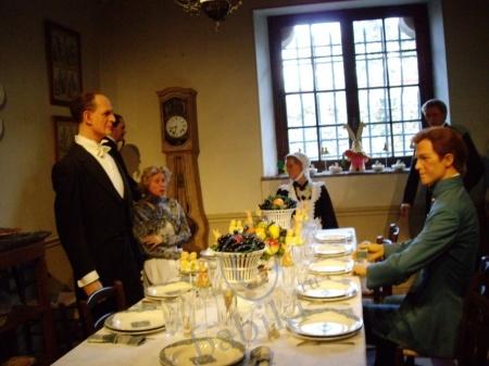 Рядом со столовой для слуг, направо от лестницы (столовая и кухня налево, на первом этаже замка), нас ждал очередной сюрприз – комната спящей красавицы. Все фигуры вокруг тоже спят – и собака, и слуги, и нянька. Не спят только прекрасный принц, приготовившийся поцеловать принцессу, и фея. Если приглядеться, то можно увидеть, как спящая красавица дышит во сне (всё включается автоматически, когда вы заходите в комнату).