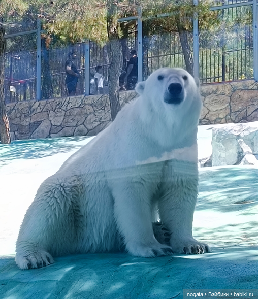 Белым мишкам стараются создать возможные комфортные условия. Этот вышел из бассейна, его шуба переливается на солнце разноцветными искрами.