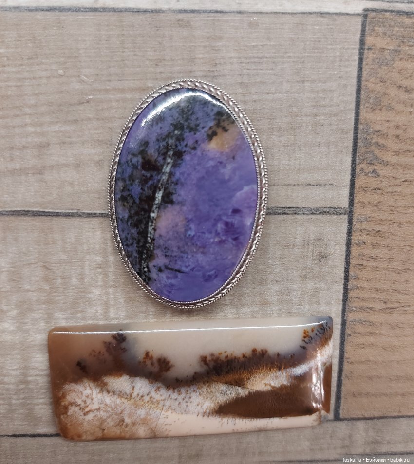 Я когда-то увлекалась поделочными камнями, покупала, когда видела что-то необычное. Это срезы камней, просто их отполировал человек, а не море. Вот чароит с березкой, агат с зимним пейзажем.