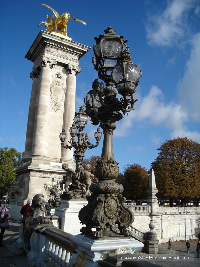 Мост Александра III – маленькая частичка русской души в загадочной Франции.Этот одноарочный изысканный мост перекинулся через Сену и соединил Дом инвалидов с Елисейскими Полями. Высота 160–метрового по длине моста составляет не более 6 метров. Такая высота была выбрана специально, чтобы не загораживать панораму Елисейских полей, а однопролетным решено было строить мост, чтобы не затруднять и без того проблемное судоходство по Сене.