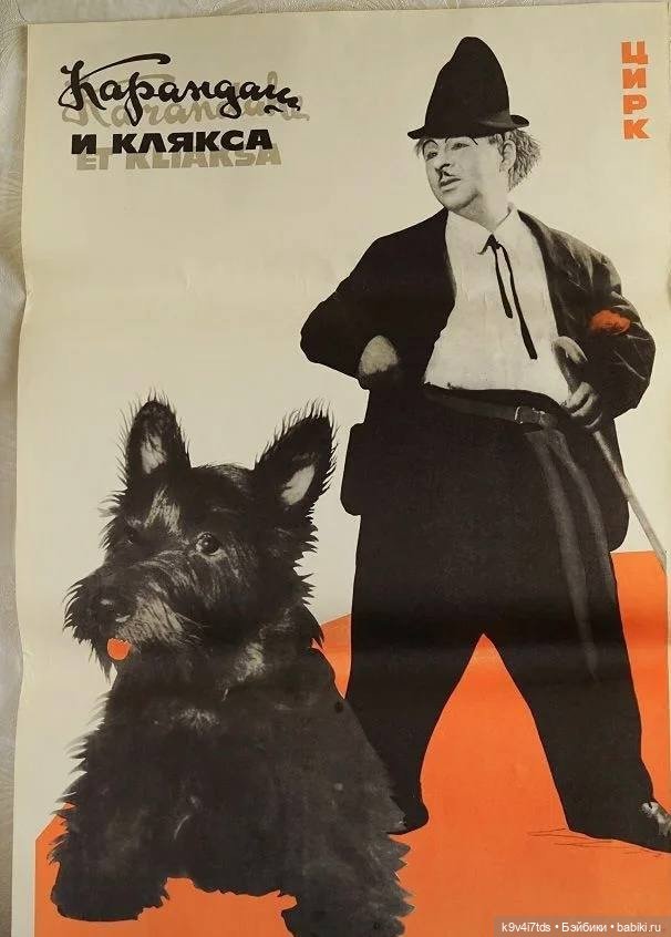 «Сначала он был точной копией Чарли Чаплина (говорят, «маленький бродяга» благословил его на это лично). Потом образ немного изменился – котелок превратился в остроконечную шляпу, а непременным спутником, вместо чаплиновской тросточки, стал скотч-терьер „Клякса“. За свою долгую карьеру Карандаш выступал, по меньшей мере, с 13 шотландцами. Кляксу назвали Кляксой, потому что первый щенок, который появился у клоуна, выглядел на арене, как лужица растекшихся чернил. Карандаш постарался воссоздать средствами клоунады реальную жизнь.» (инф. из интернета)