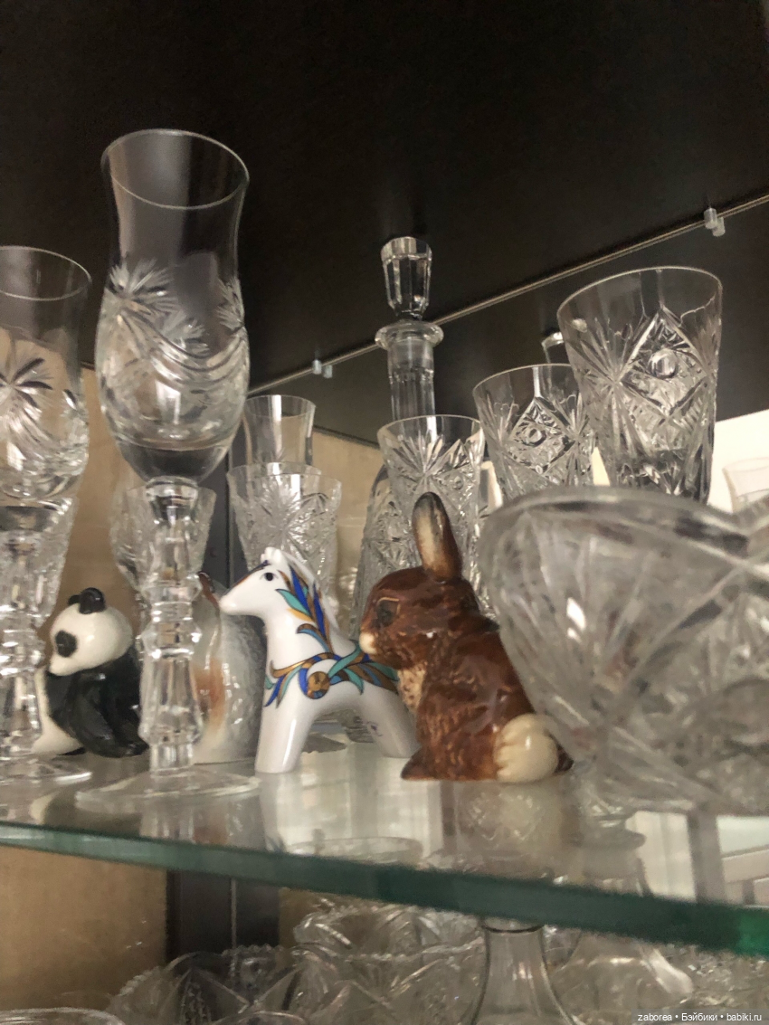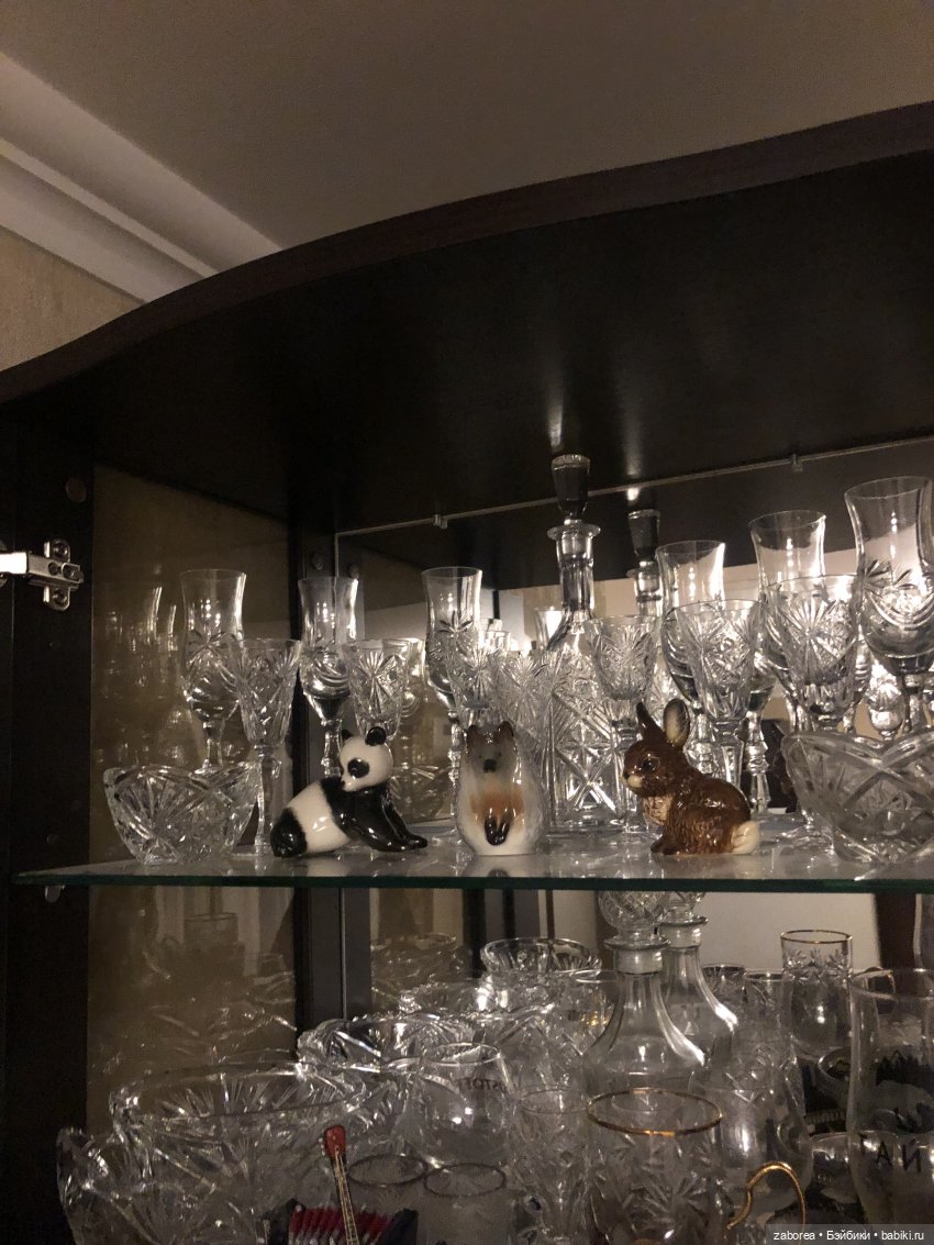 У меня от родителей очень много хрусталя осталось. На верхней полочке в середине рюмочки на высоких ножкаж-у меня таких две, вазочка слева-тоже есть. Очень ценю эти изделия, как память о родителях, ведь когда то они собирались с родственниками и друзьями, произносили прекрасные тосты, чекались этими рюмочками, а в вазочках лежали салатики. Чем старше становлюсь, тем больше ценю эту старину.