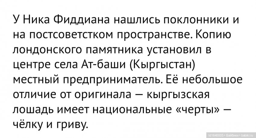 «Знаменитый лондонский Гайд-парк ежедневно привлекает тысячи туристов, приезжающих в британскую столицу. Одной из первых скульптур, которая предстает взорам посетителей при входе в парк, является скульптура „Голова лошади, пьющей воду“. Она была изготовлена скульптором Ником Фриддианом-Грином и установлена в 2010 году.